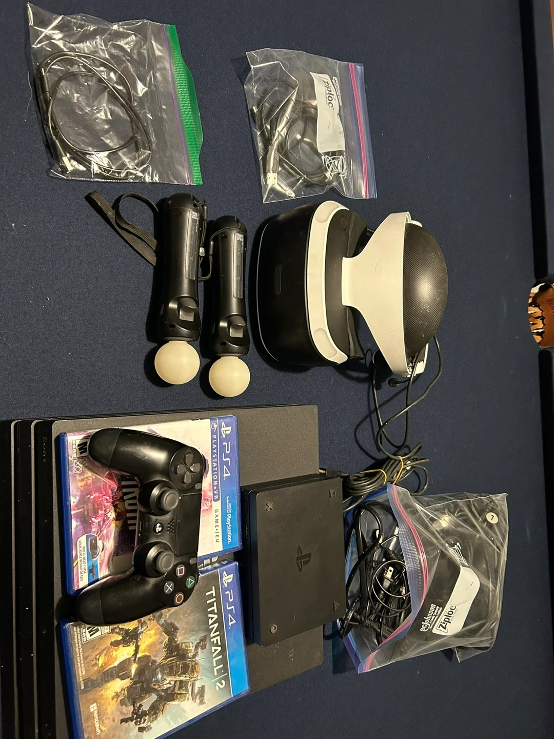 Selling a PlayStation VR bundle! Includes the headset, two move controllers, a PlayStation 4 pro, and two games: Everybody's Golf and Titanfall 2. All the necessary cables are included as well, so you're ready to jump into virtual reality gaming!