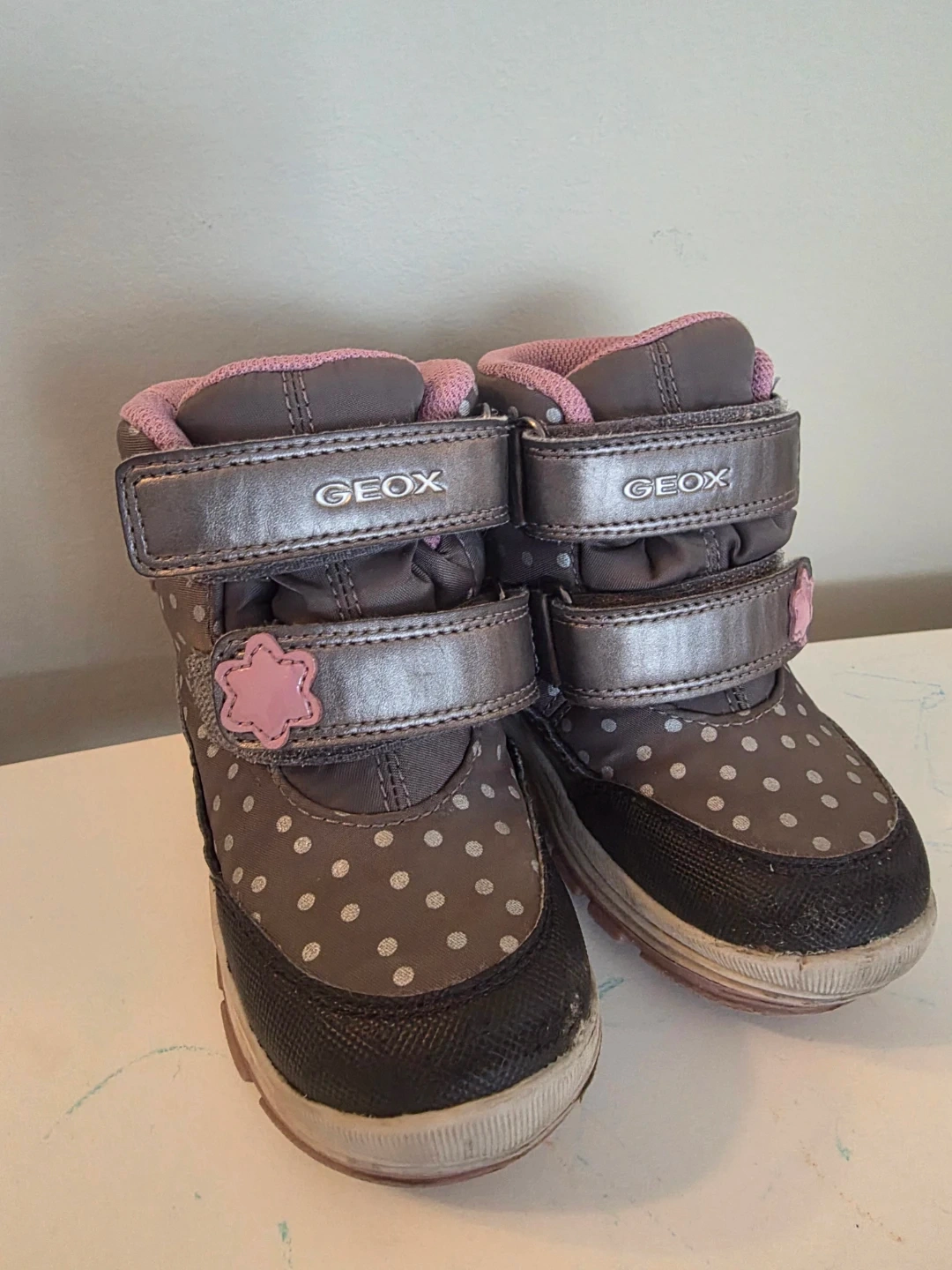 Selling a pair of Geox toddler girl boots in size 7. They feature a cute polka dot design with a silver and grey colour scheme, and a pink flower detail. The soles have Geox's flexy system.