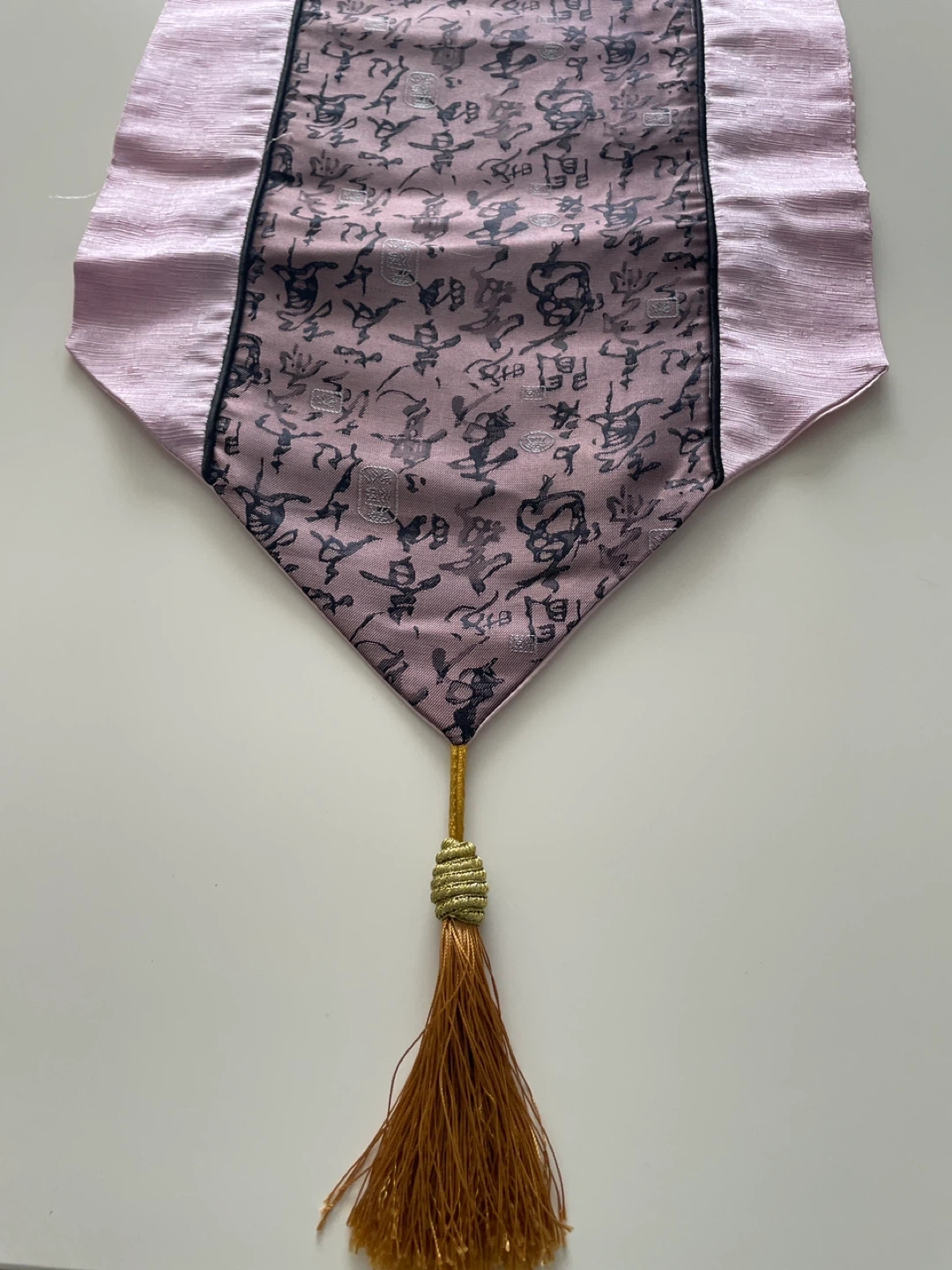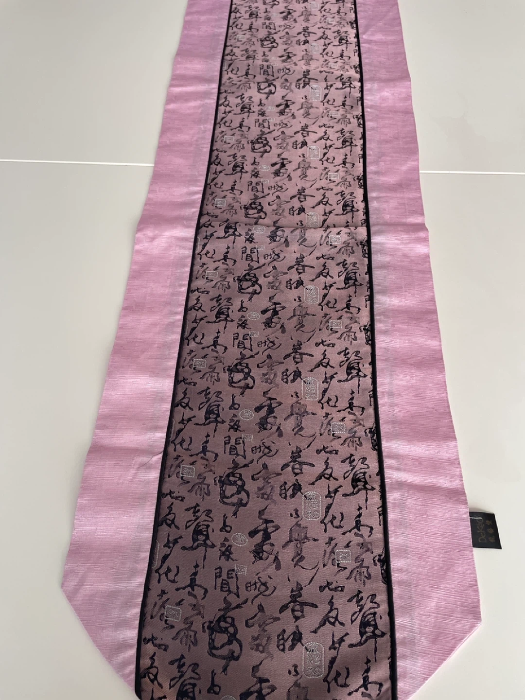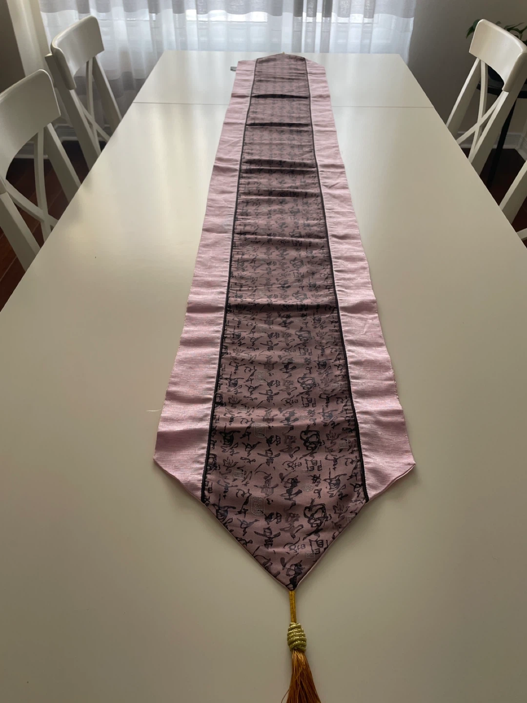 This is a lovely table runner featuring a pink border and a central panel with an Asian calligraphy design. It adds a touch of elegance and culture to any dining setting. The runner is in great condition and ready to enhance your home decor