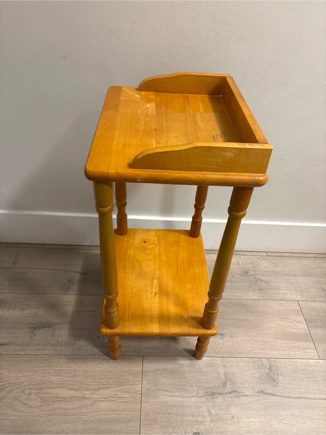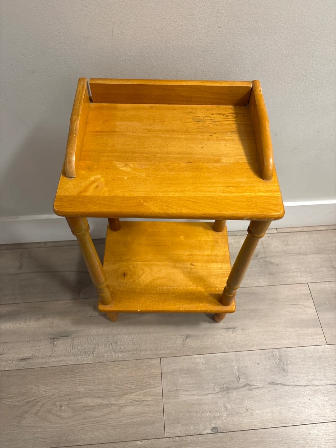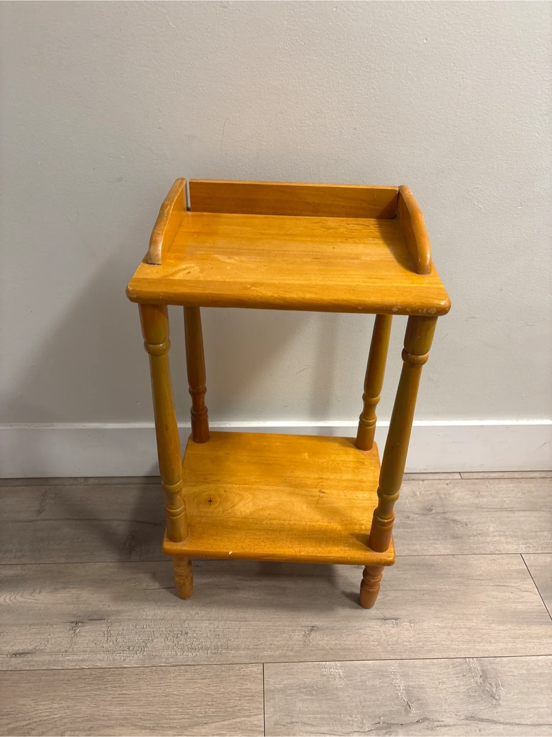 A cute little wooden side table with two tiers! It's perfect for a small space or as a bedside table. The wood has a nice warm tone.
