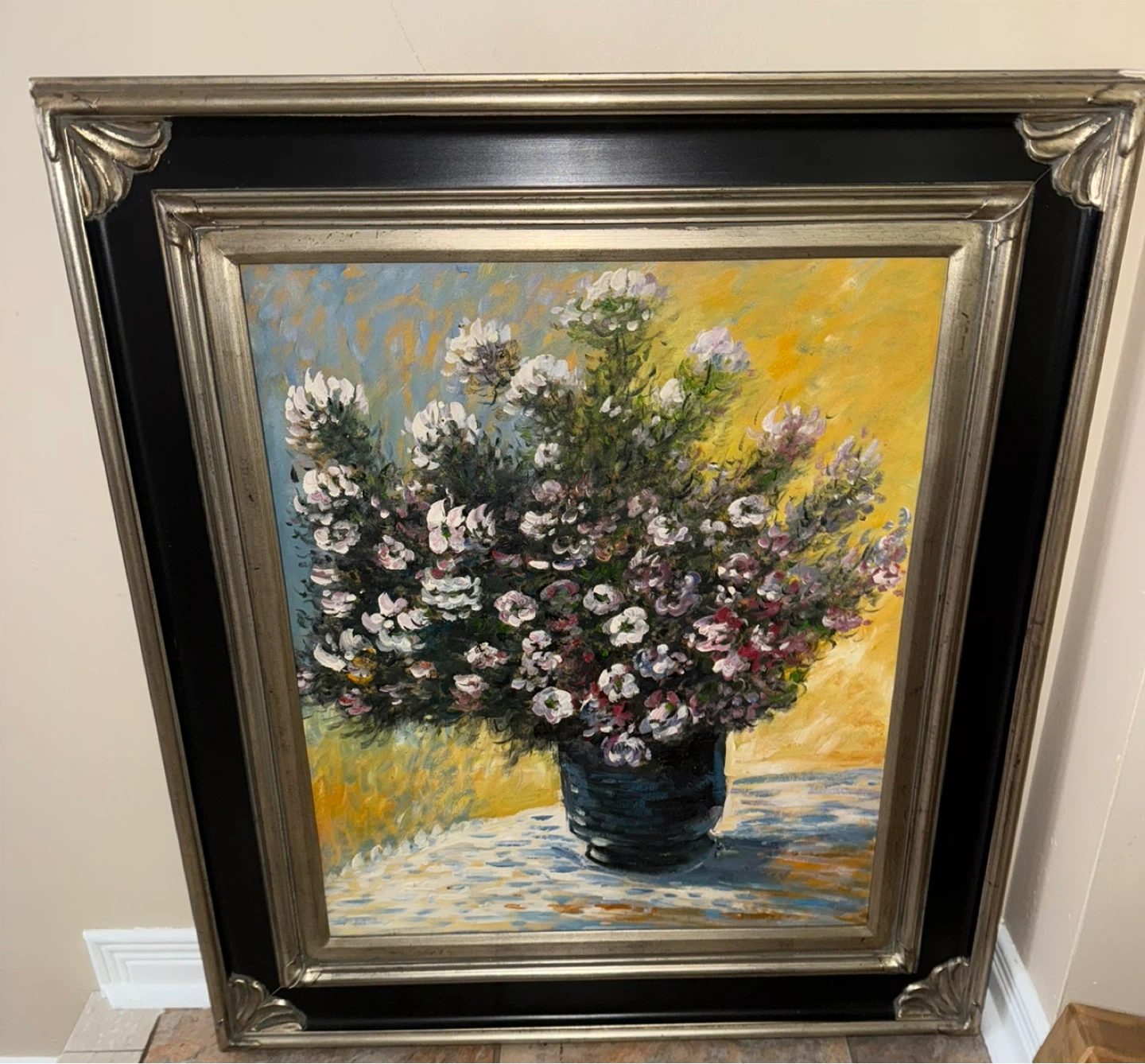 A beautiful framed oil painting of flowers in a vase. The frame is black and silver, adding a touch of elegance to the artwork. Perfect for adding a pop of colour to your home!