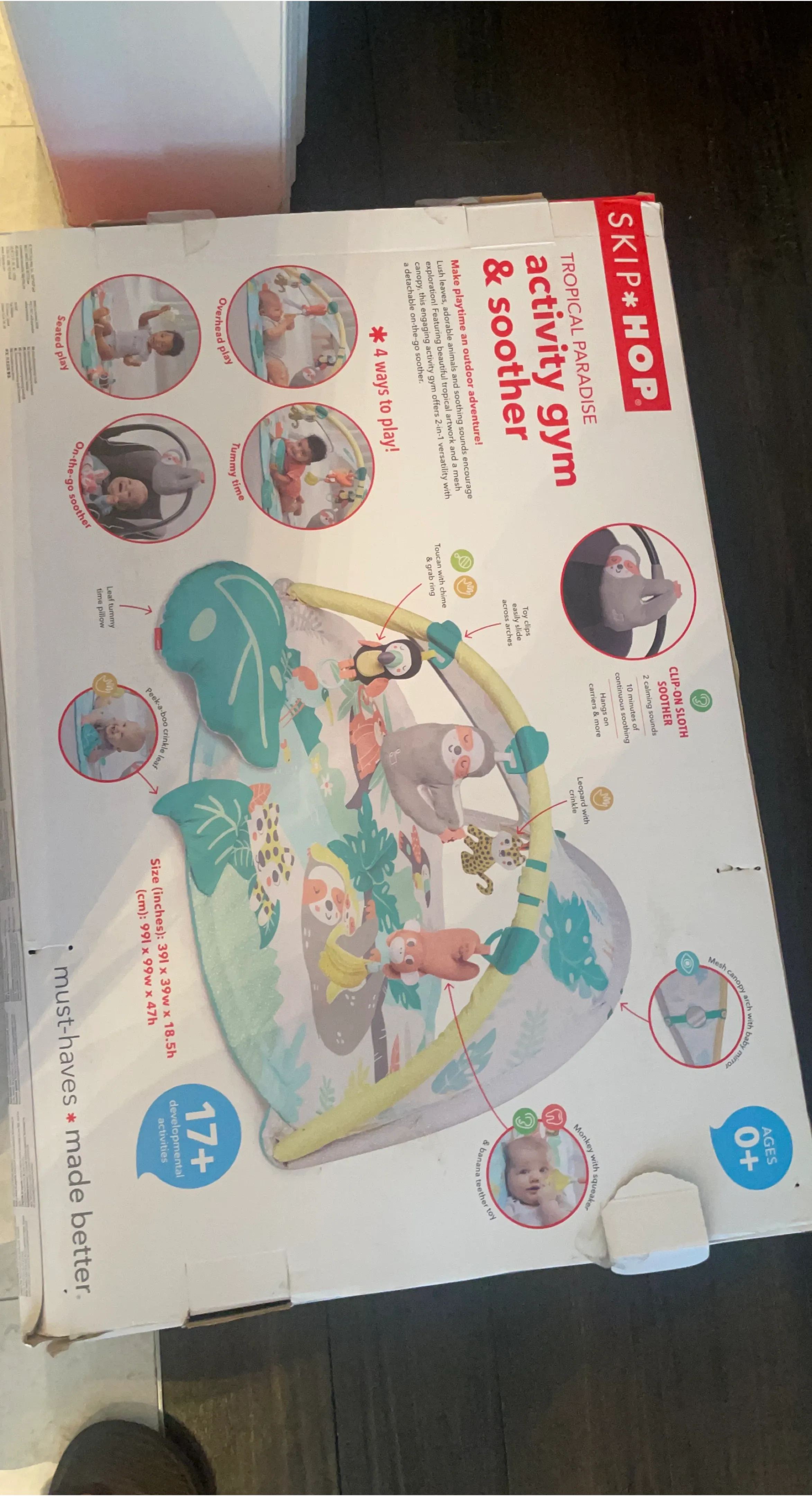 It has beautiful tropical artwork and a mesh canopy. This engaging activity gym offers 2-in-1 versatility with a detachable on-the-go soother. There are 4 ways to play! The size is 39 inches x 39 inches x 18.5 inches