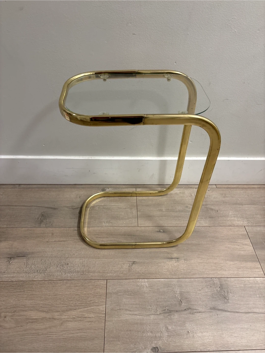Selling a brass side table with a glass top. It's in great condition and would be a lovely addition to any living space!