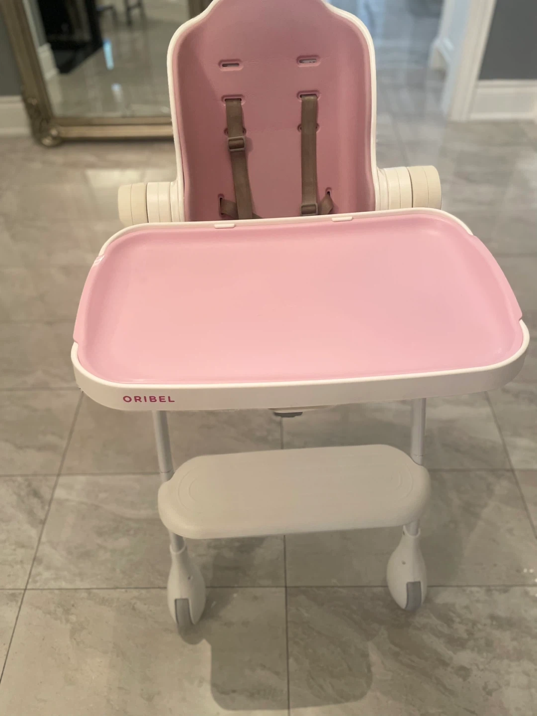 Selling a gently used Oribel Cocoon Z high chair in pink. It's in great condition and comes with a tray and a cup holder attachment for added convenience