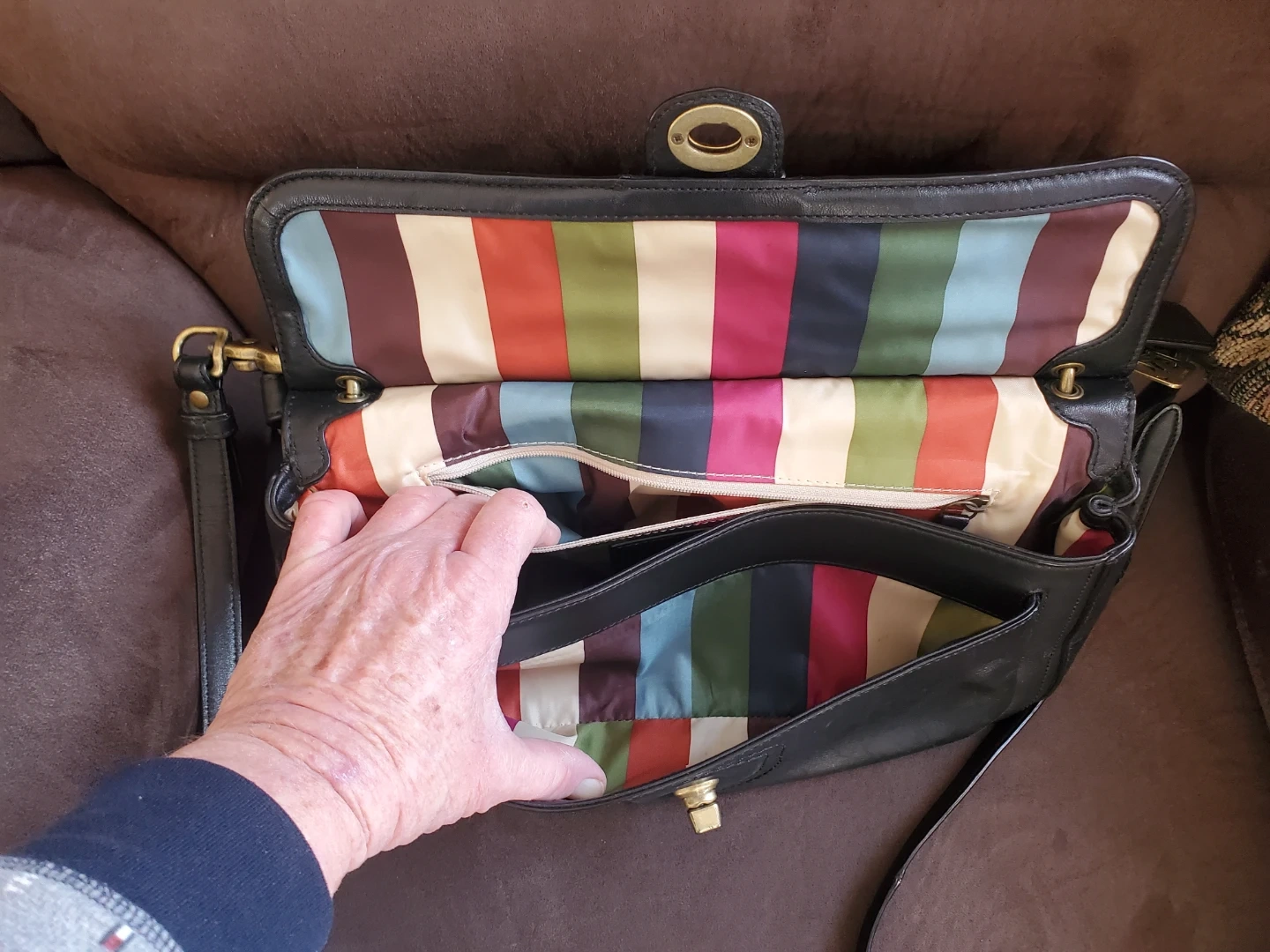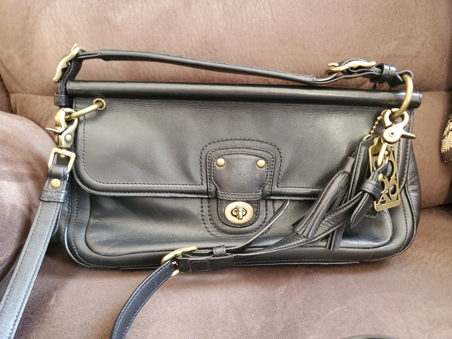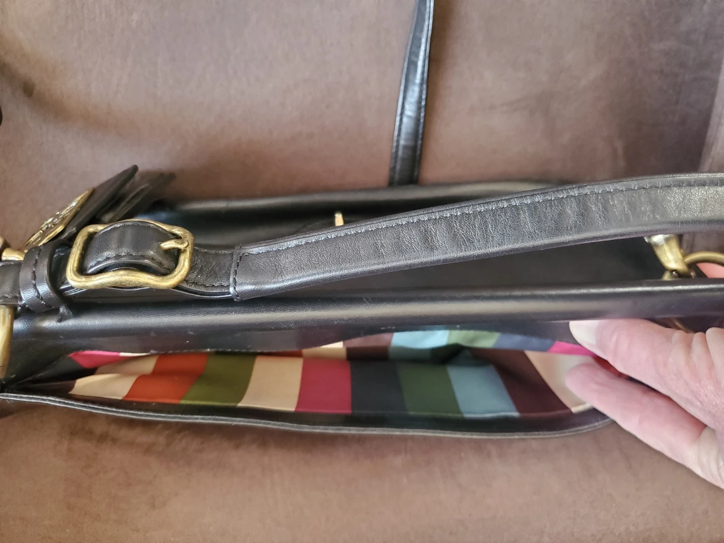 Selling a stylish Coach black leather handbag! It's in great condition and comes with its original dust bag. The interior has a fun, colourful striped lining. Perfect for adding a touch of class to any outfit! This bag is retail, not outlet. Reduced price if you buy both COACH bags.