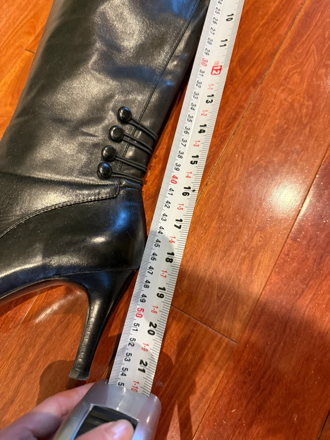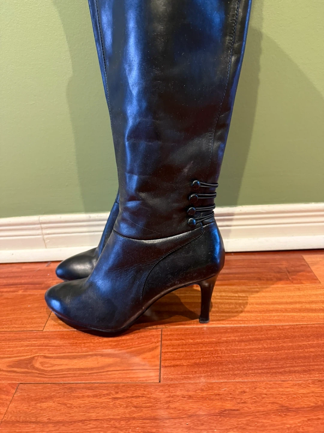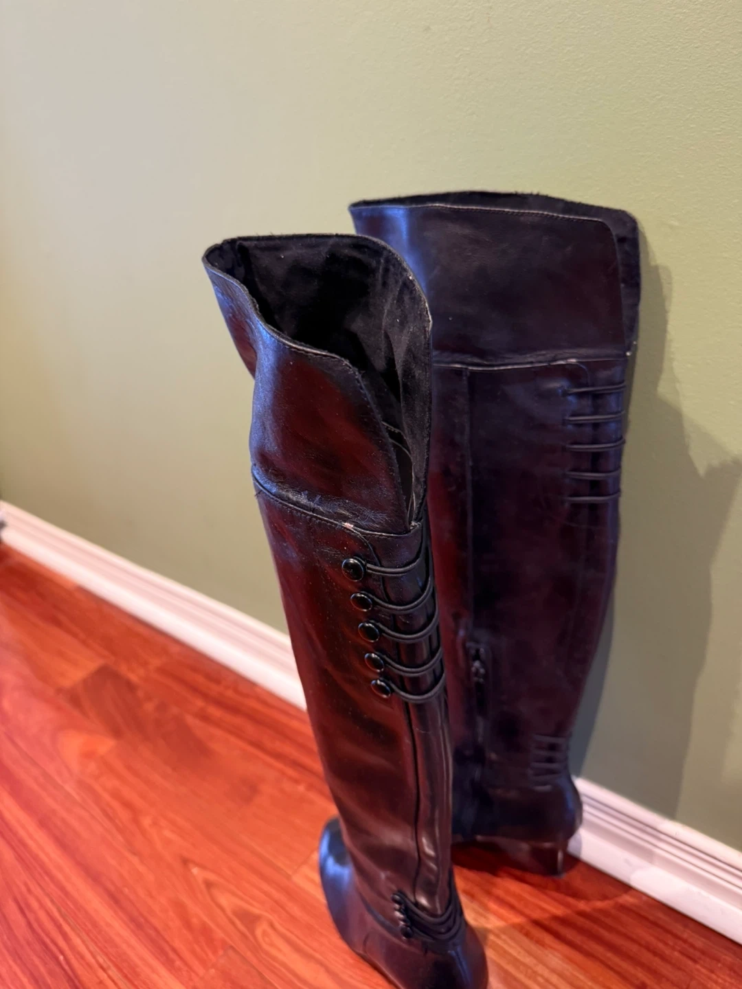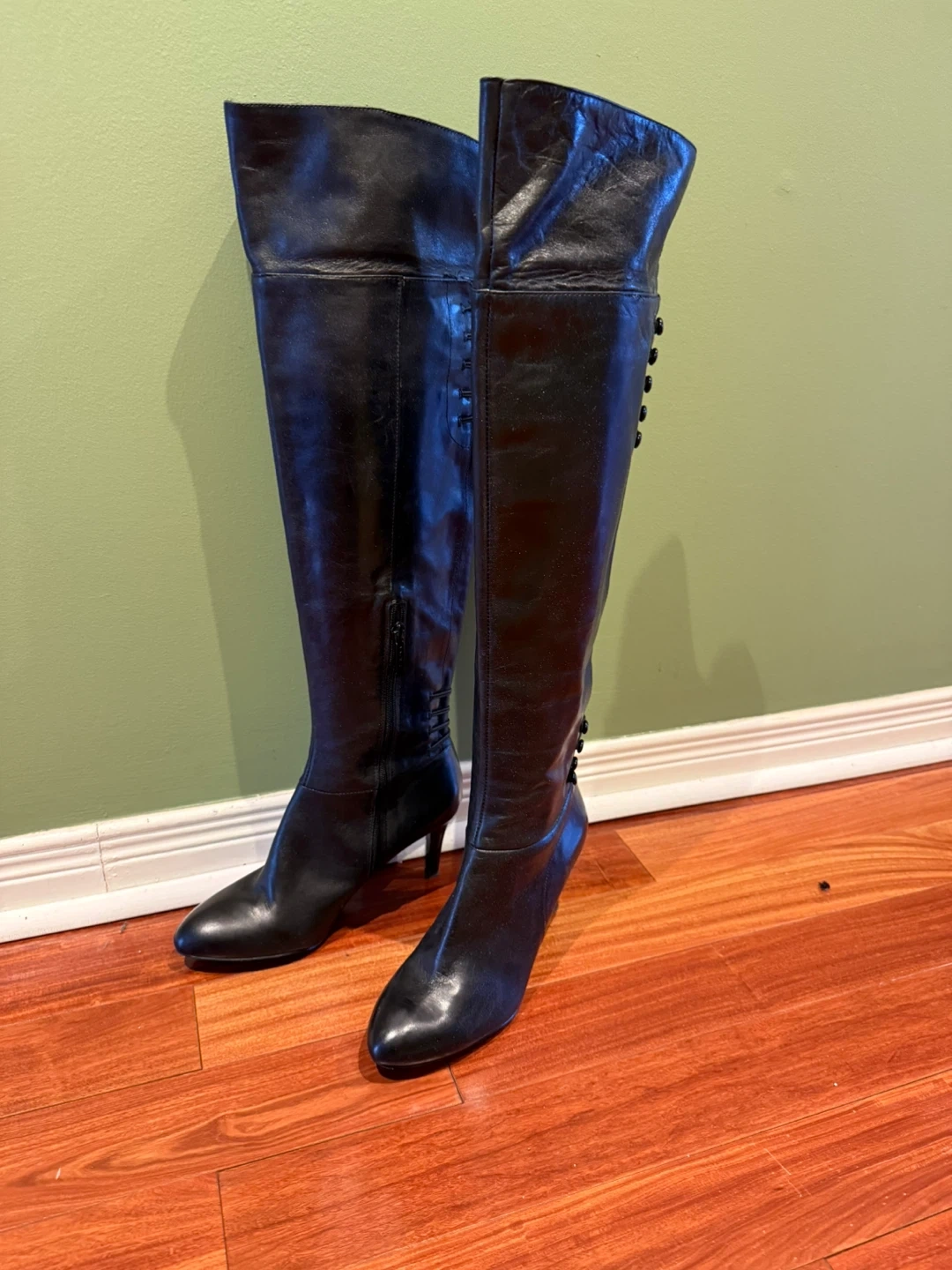 Selling a pair of stylish black leather thigh-high boots! They feature a sleek design with button detailing on the back. Perfect for adding a touch of elegance to any outfit. They are in great condition!