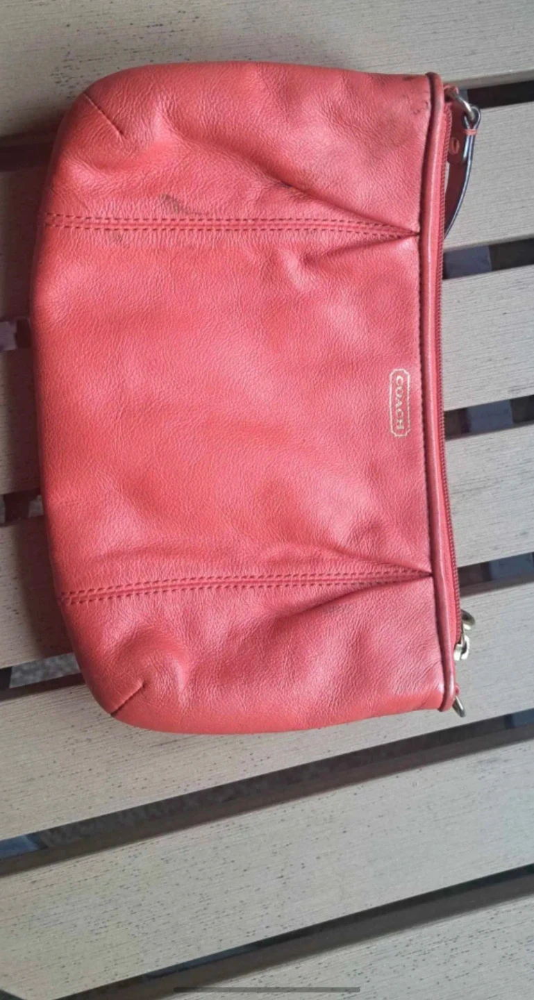 This is a coral-coloured Coach wristlet. It's perfect for carrying your essentials when you don't want to lug around a big purse. It is in good condition with some signs of wear.