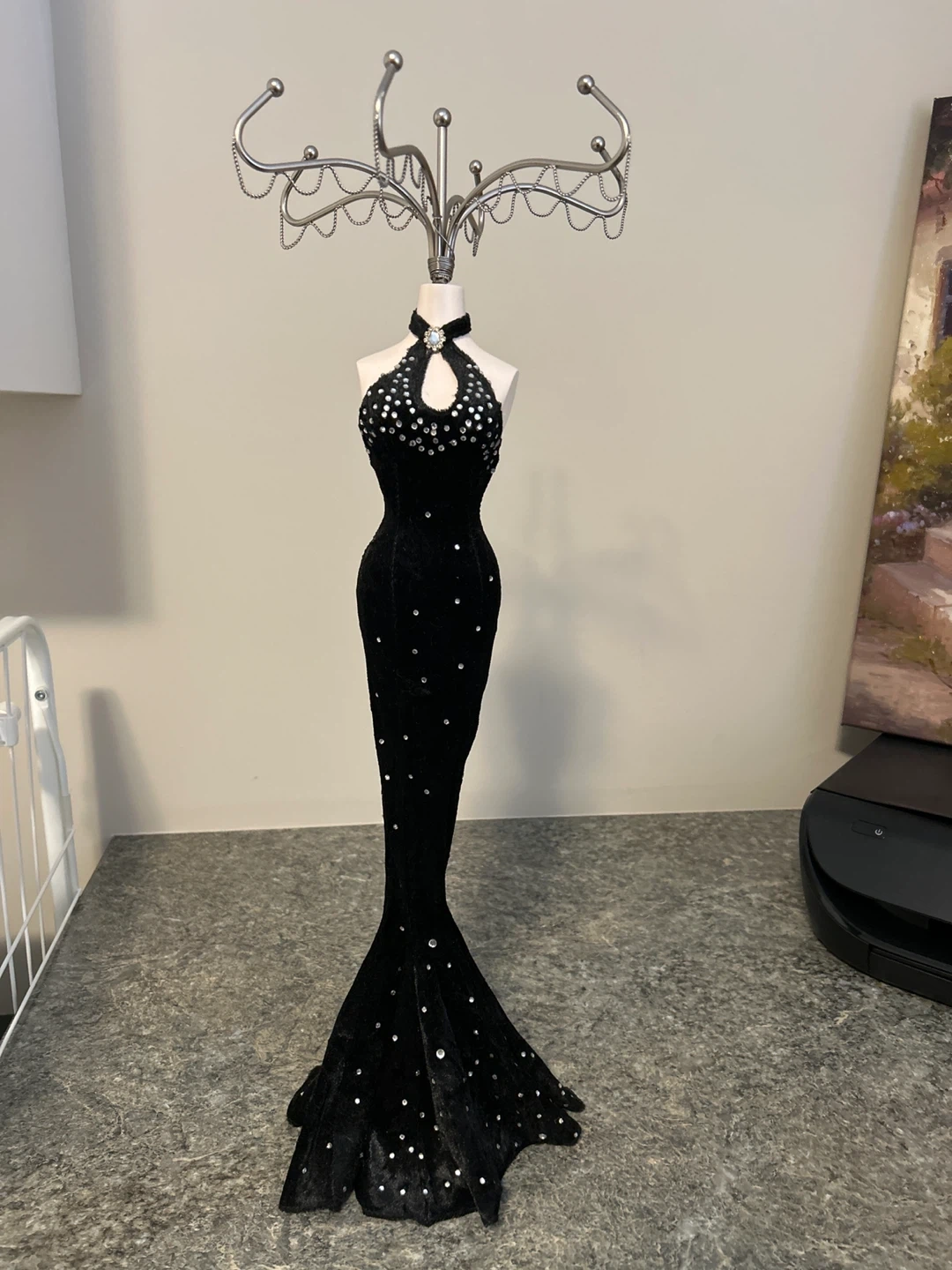 This is a unique jewelry stand that features a dress form. It's perfect for displaying necklaces, bracelets, and earrings. It adds a touch of elegance to any dresser or vanity!