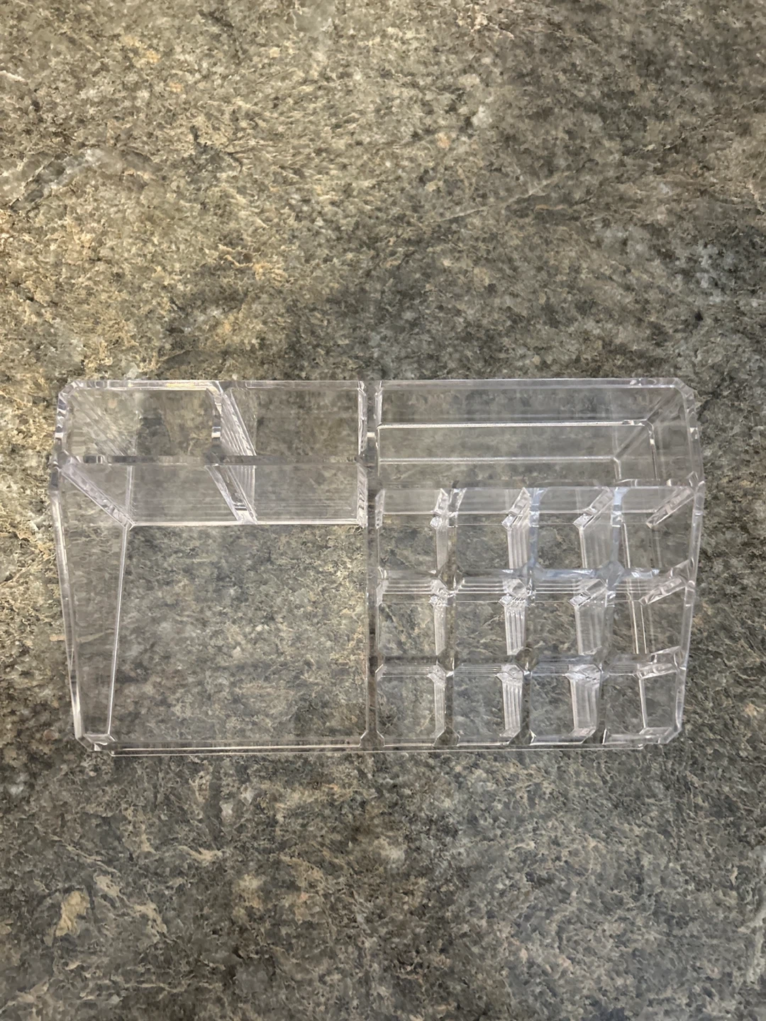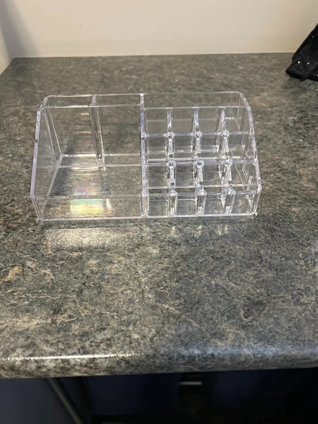 Selling a clear acrylic makeup organizer. It's perfect for keeping all your cosmetics neat and tidy on your vanity or bathroom counter. It features multiple compartments of various sizes to accommodate different types of makeup and accessories. Great for decluttering!