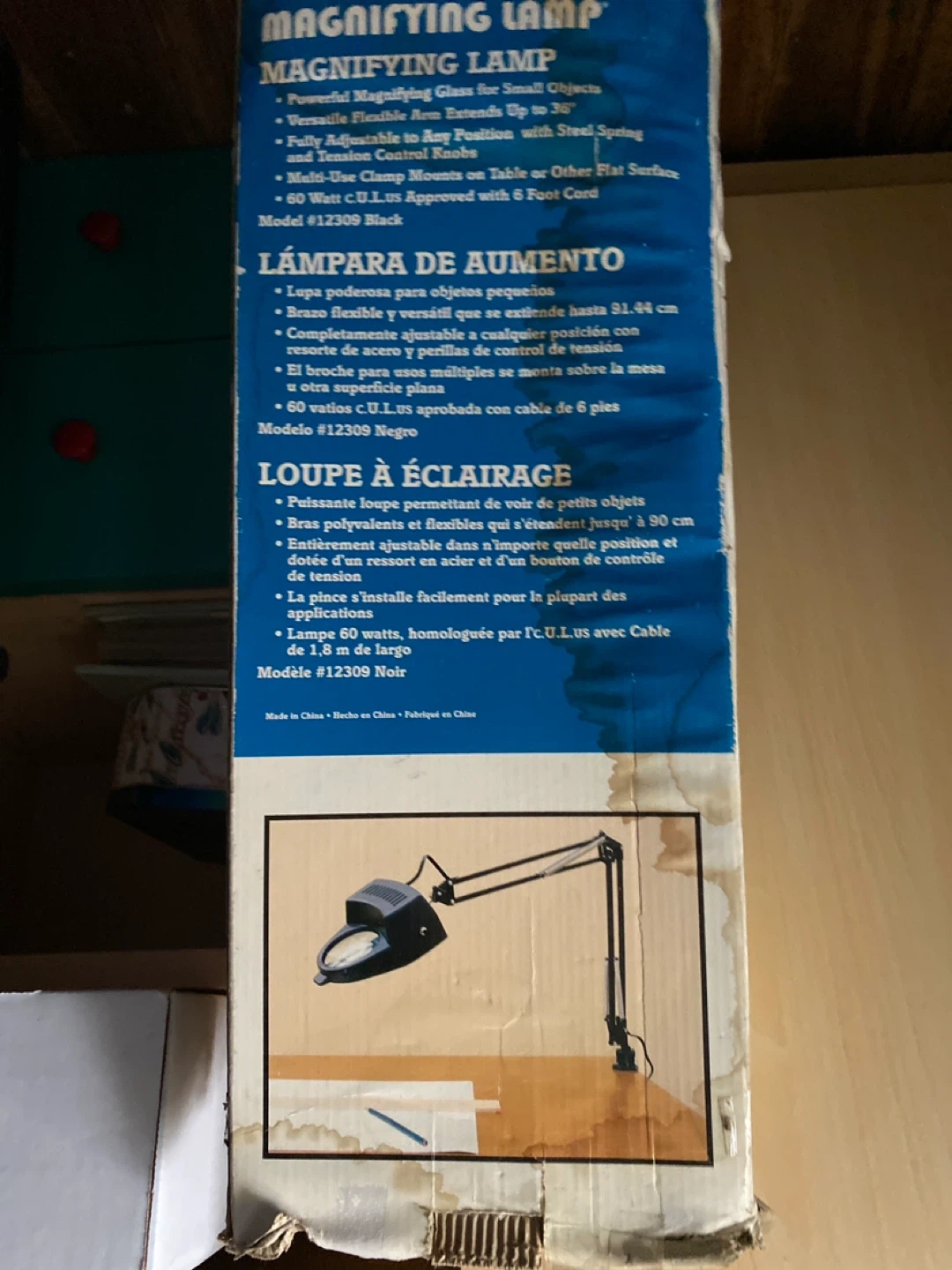 Selling a magnifying lamp, model #12309 in black. It has a powerful magnifying glass for small objects and a versatile, flexible arm that extends up to 36 inches. Fully adjustable to any position with steel spring and tension control knobs. The multi-use clamp mounts on a table or other flat surface. It's 60 Watt and C.U.Lus approved with a 6 foot cord