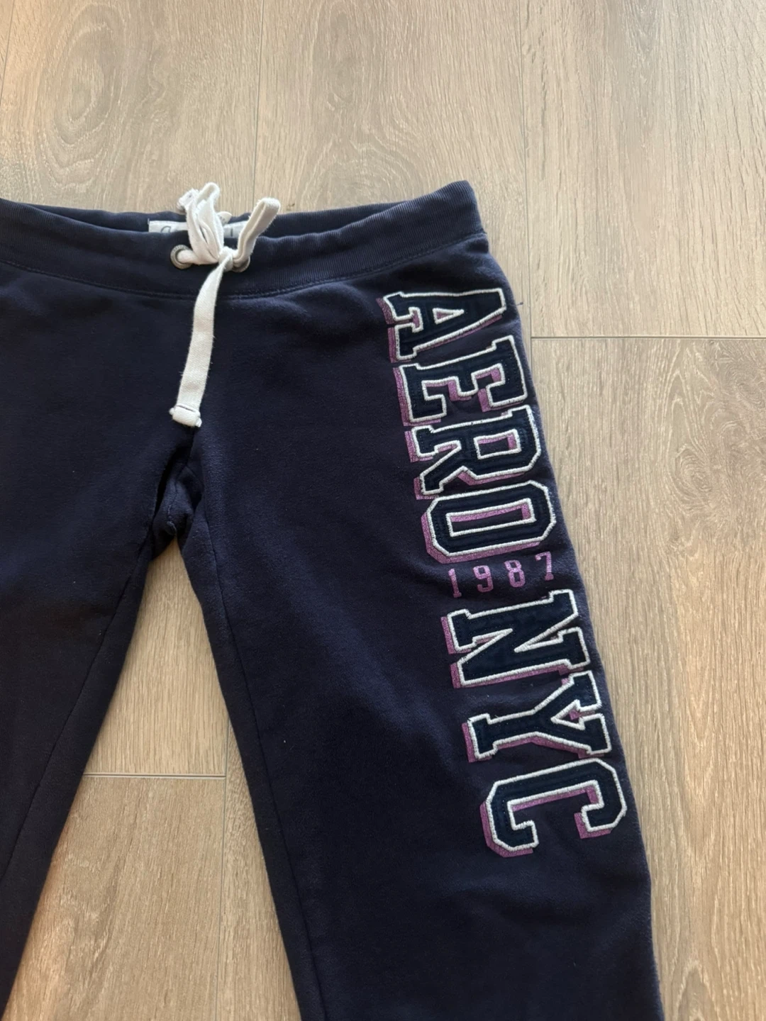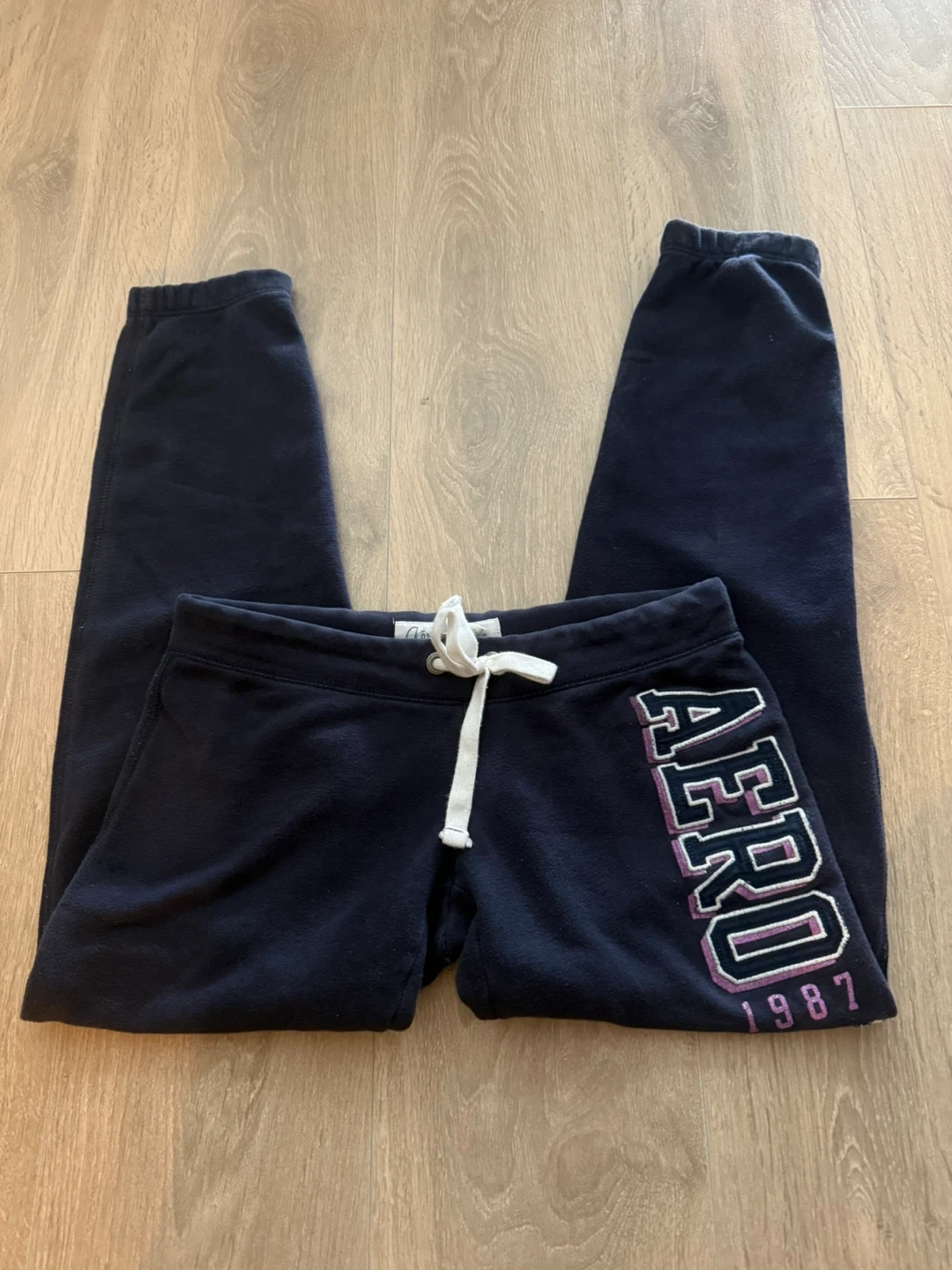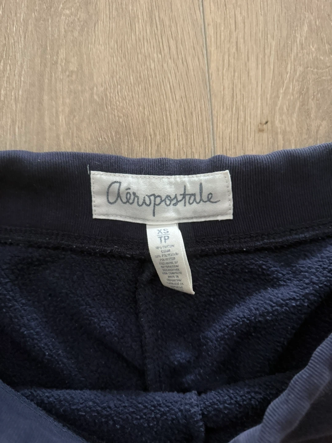Selling a pair of Aeropostale sweatpants in navy blue! They're a size XS and made of 100% cotton. Perfect for lounging around the house or running errands.