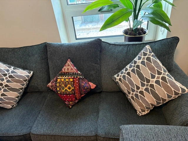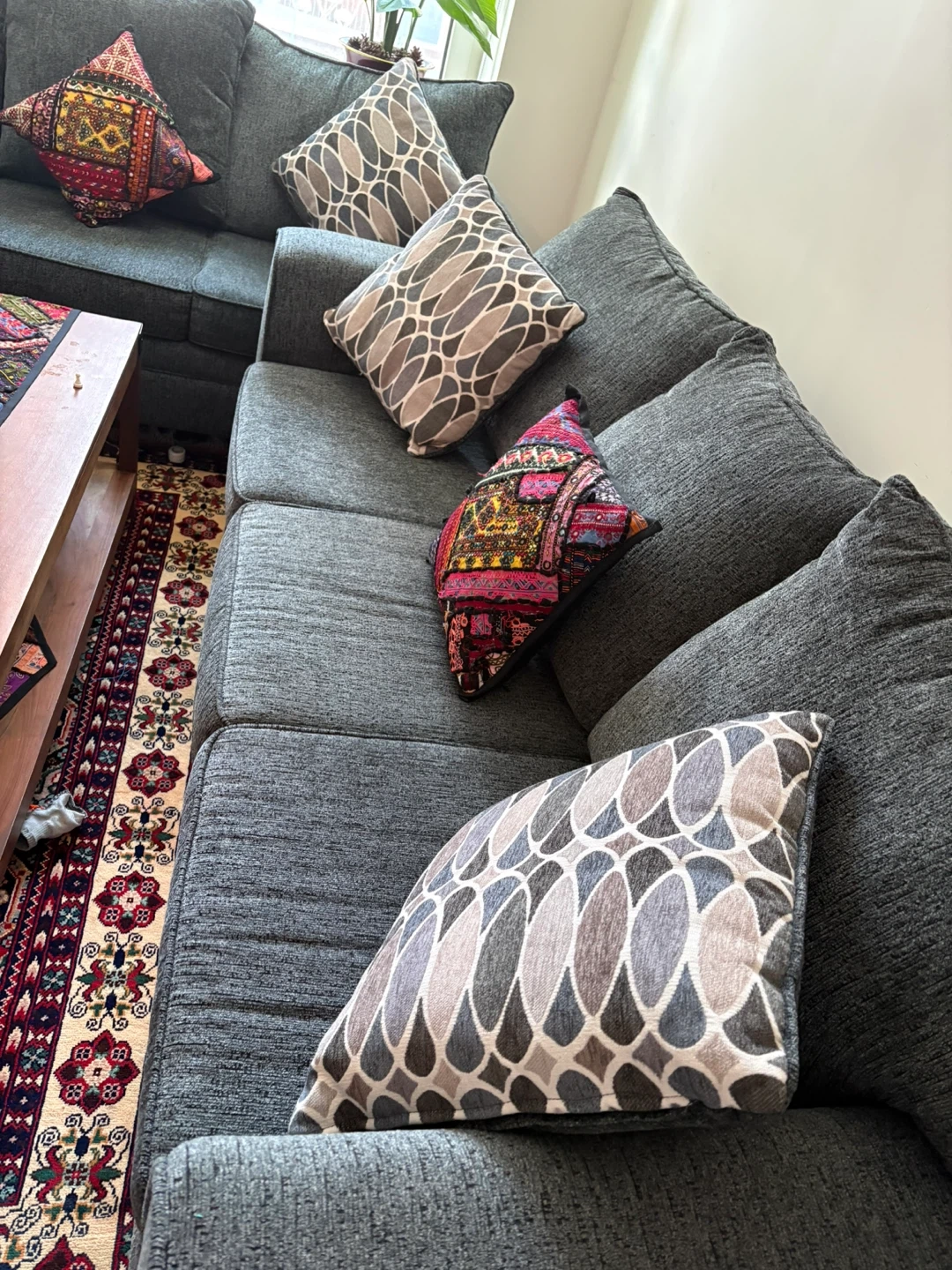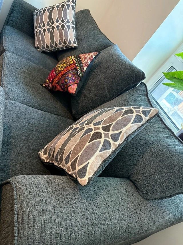 High-quality 2-piece grey fabric sofa set, designed as a 3-seater, in excellent condition. The sofa has never been used and is completely brand new. Very comfortable, sturdy, and made with premium materials. Modern and elegant design, perfect for living rooms, condos, or offices. Comes with decorative pillows as shown in the photos. From a clean, smoke-free home.