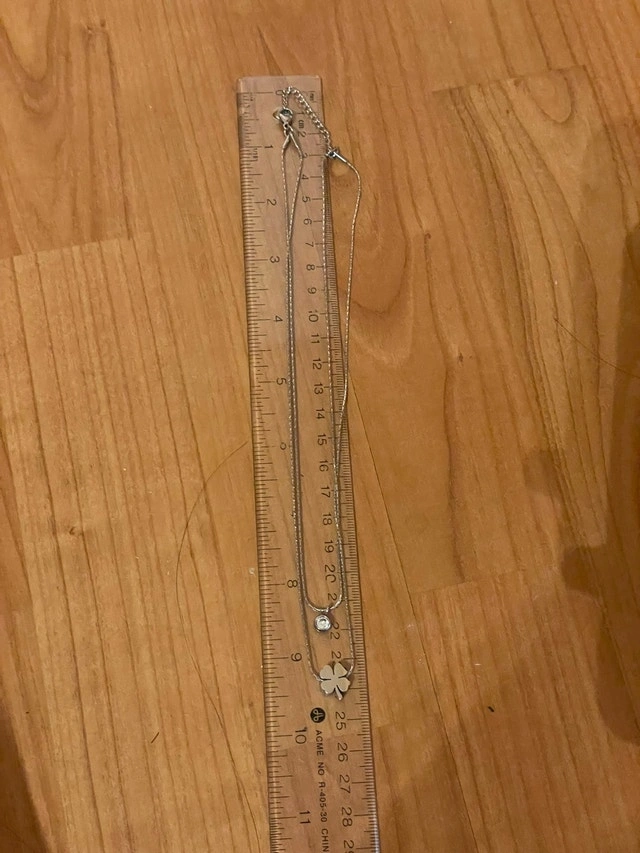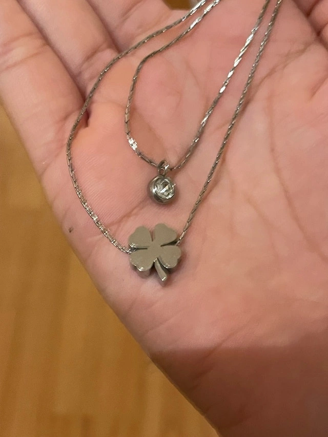 This charming, layered silver necklace features a delicate four-leafed clover and a small, sparkling stone, perfect for adding a touch of luck and elegance to any outfit. In good condition, this necklace is a delightful accessory.