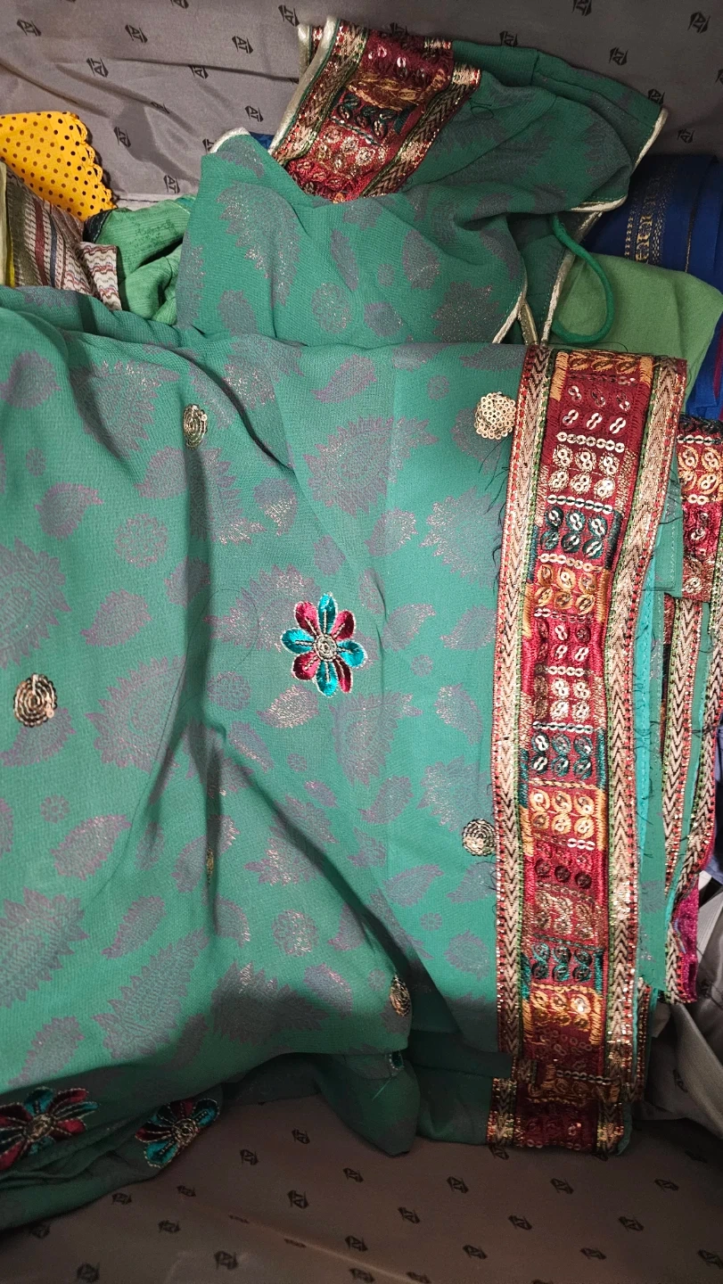 Beautiful green sari with a detailed embroidered border. The fabric has a subtle pattern and small decorative embellishments. Perfect for a special occasion! It comes with ready-made blouse.