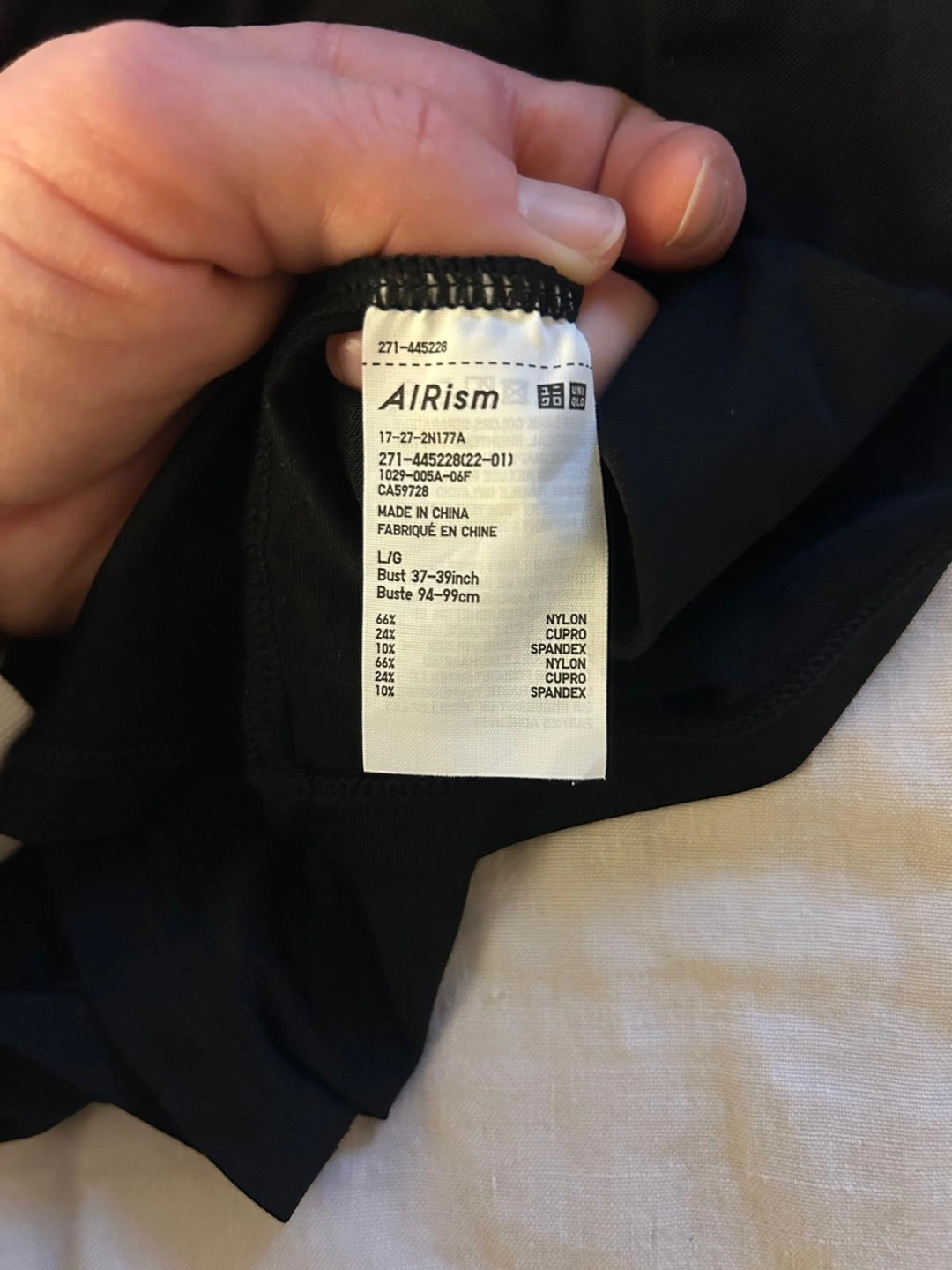 Size large. Super comfortable, stretchy, breathable and airy. Nice to wear under see through tops without feeling hot and stuffy. 65% Nylon, 25% Cupro, 10% Elastane ( 47% Made From Recycled Nylon )