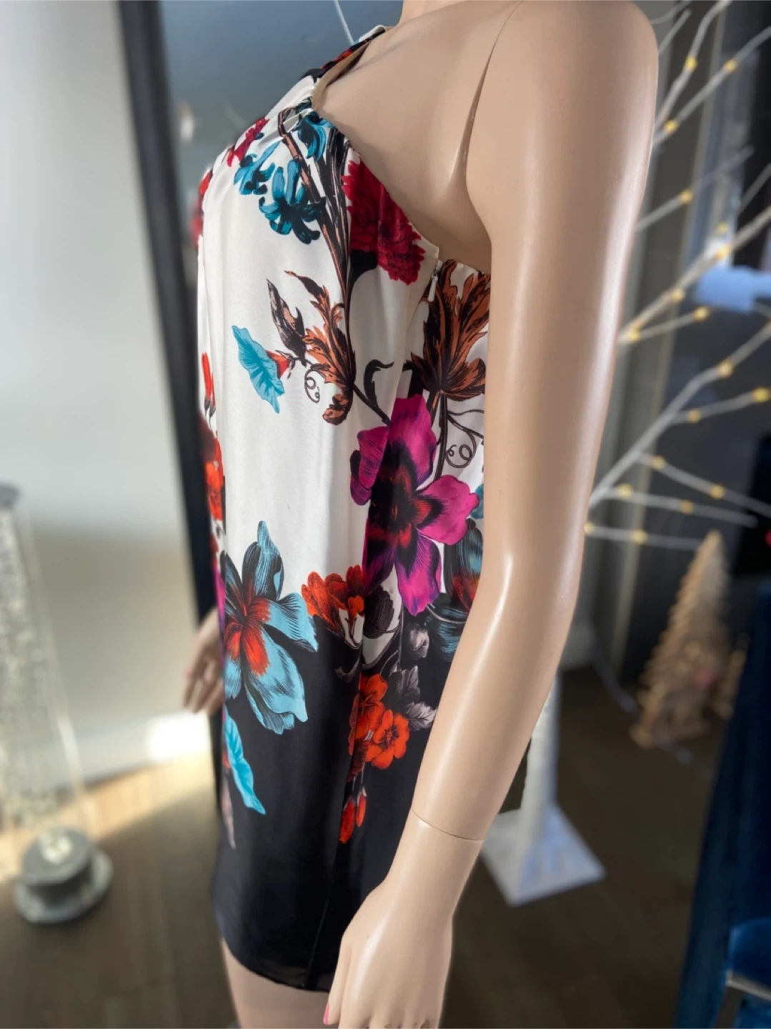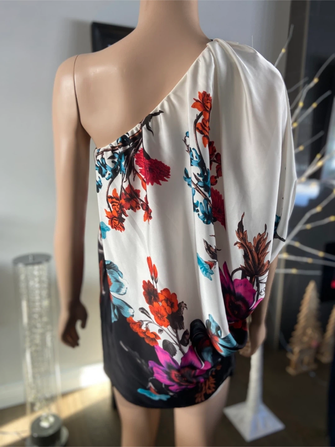 Beautiful floral one-shoulder dress by Aqua in perfect condition and from a smk-free home. The dress features a vibrant floral pattern on a white and black background. Perfect for a special occasion or a night out!