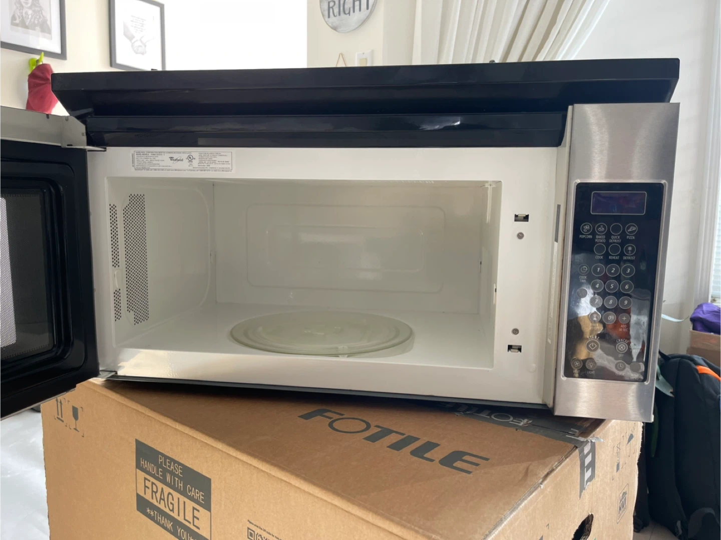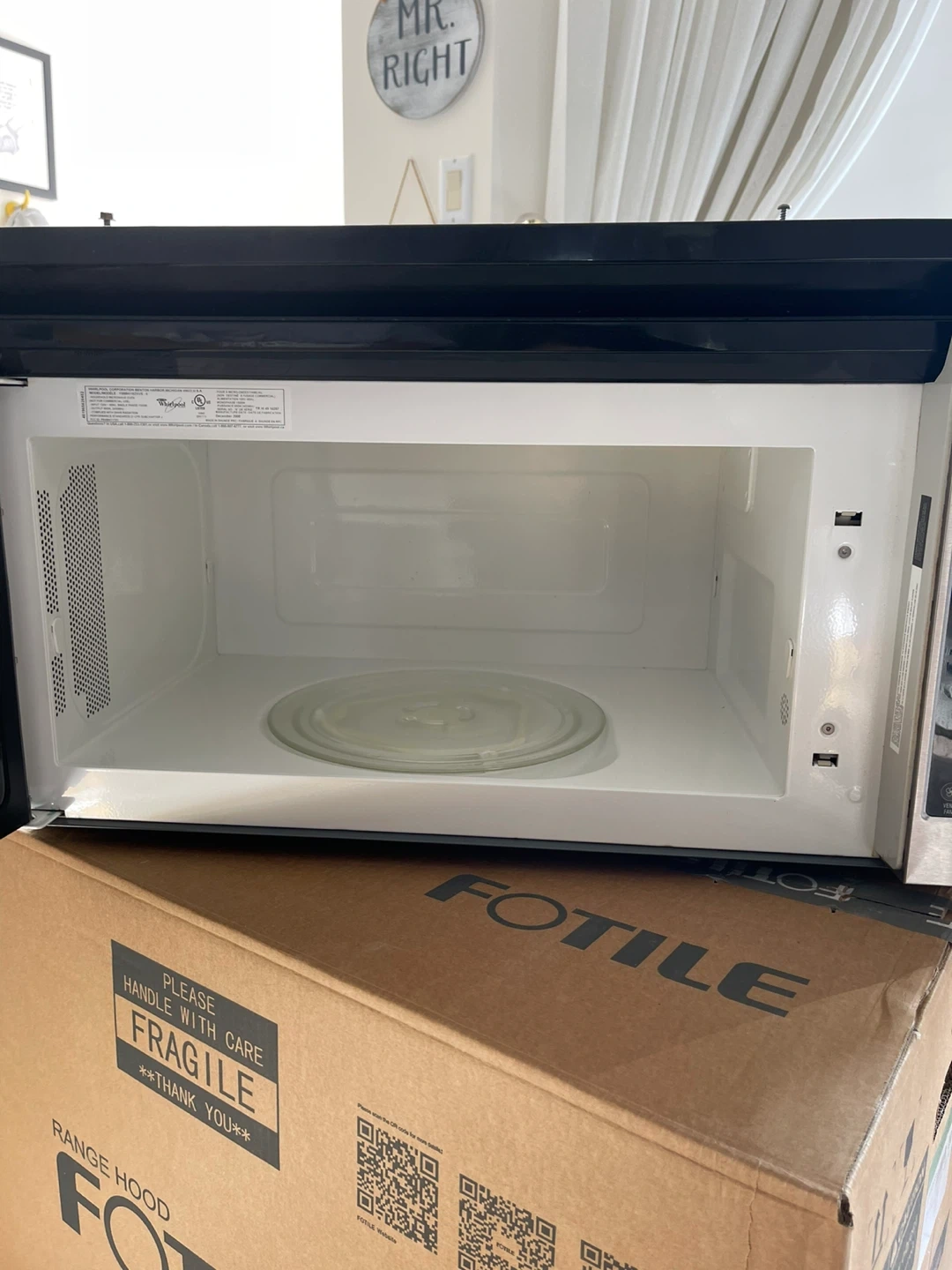 Selling a Whirlpool over-the-range microwave in stainless steel. It's in good working condition and ready to heat up your meals! It has a sleek design that will fit right into your kitchen, and the interior is nice and clean. Perfect for saving counter space
