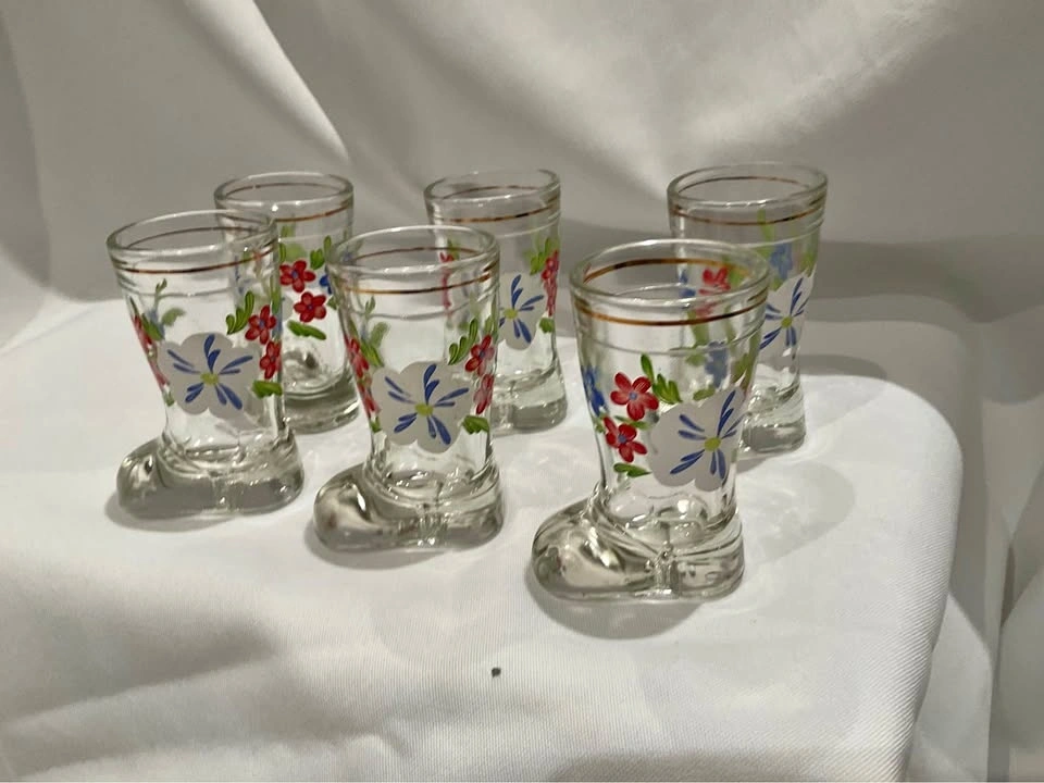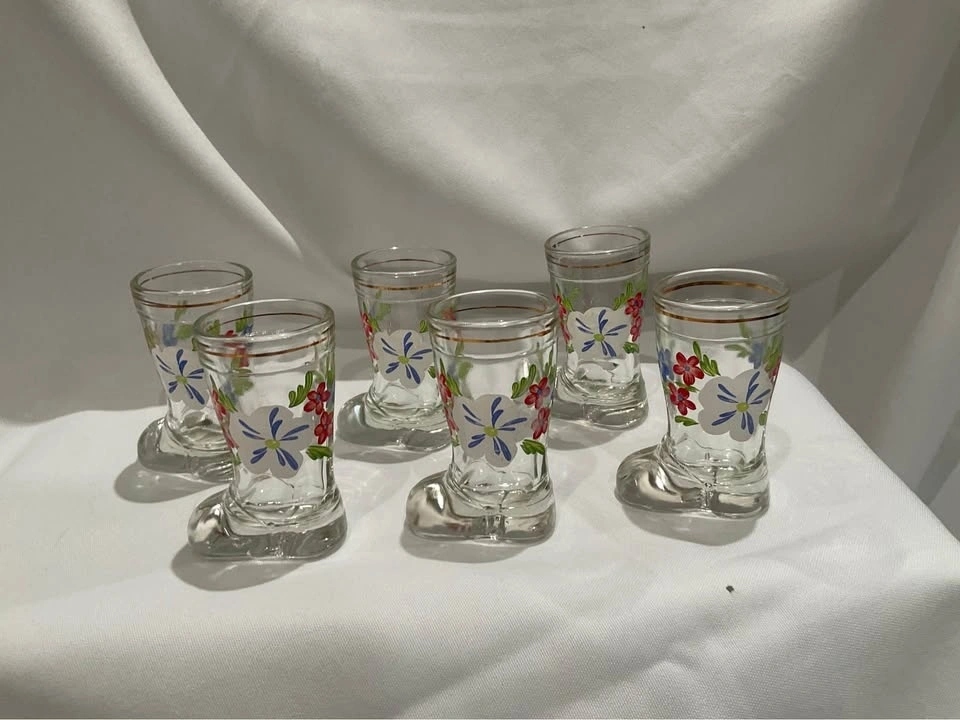 Kitschy vintage Italian liqueur glasses with a floral motif and gold rim. Good condition. Each glass holds 1.5 ounces and is 3 inches tall. From a smoke and pet-free home. Located in Richmond Hill near Bathurst & King Rd.