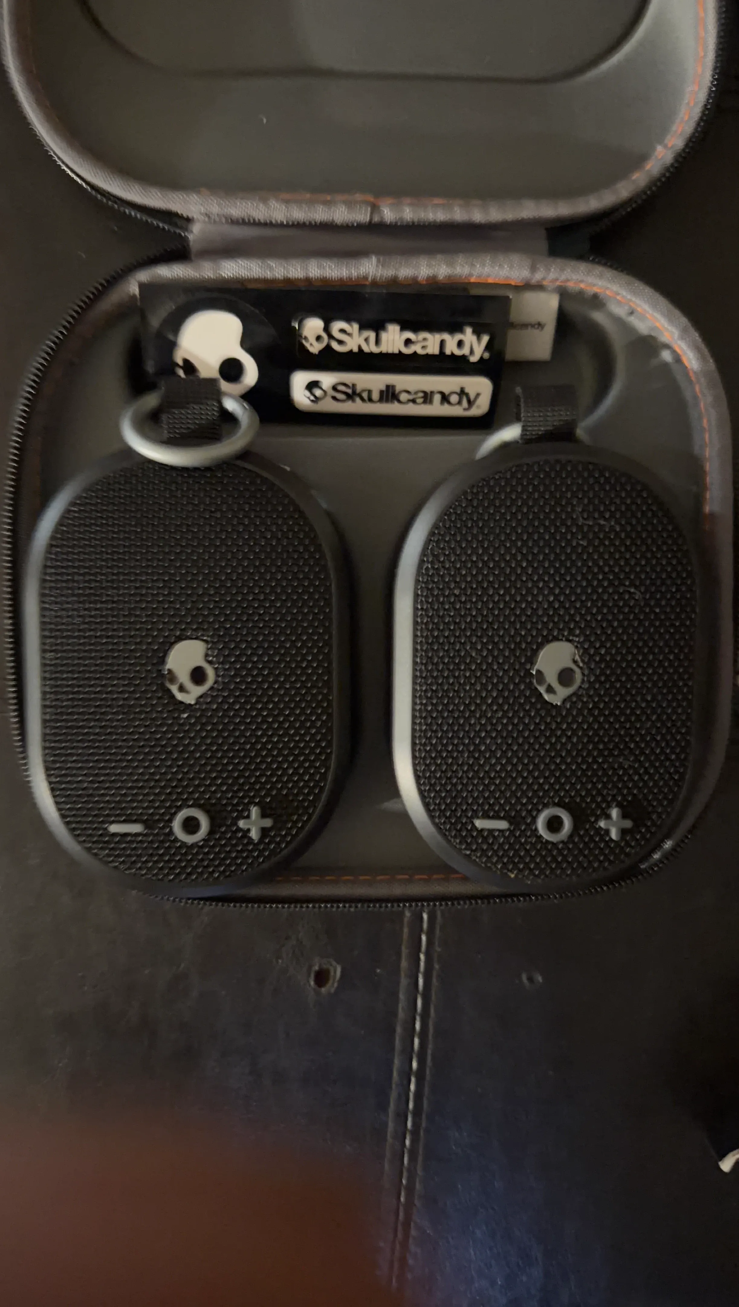 Selling a pair of Skullcandy portable Bluetooth speakers in black. They come with their original carrying case. These speakers are great for on-the-go listening! It's a convenient set for personal use or sharing music with a friend.