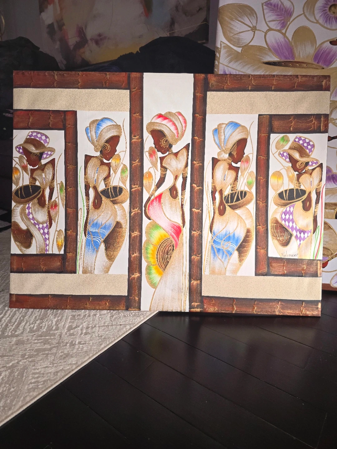 This triptych wall art depicts stylized African women in vibrant colours. The textured details and gold accents add a unique touch. It's a striking piece for home decor.