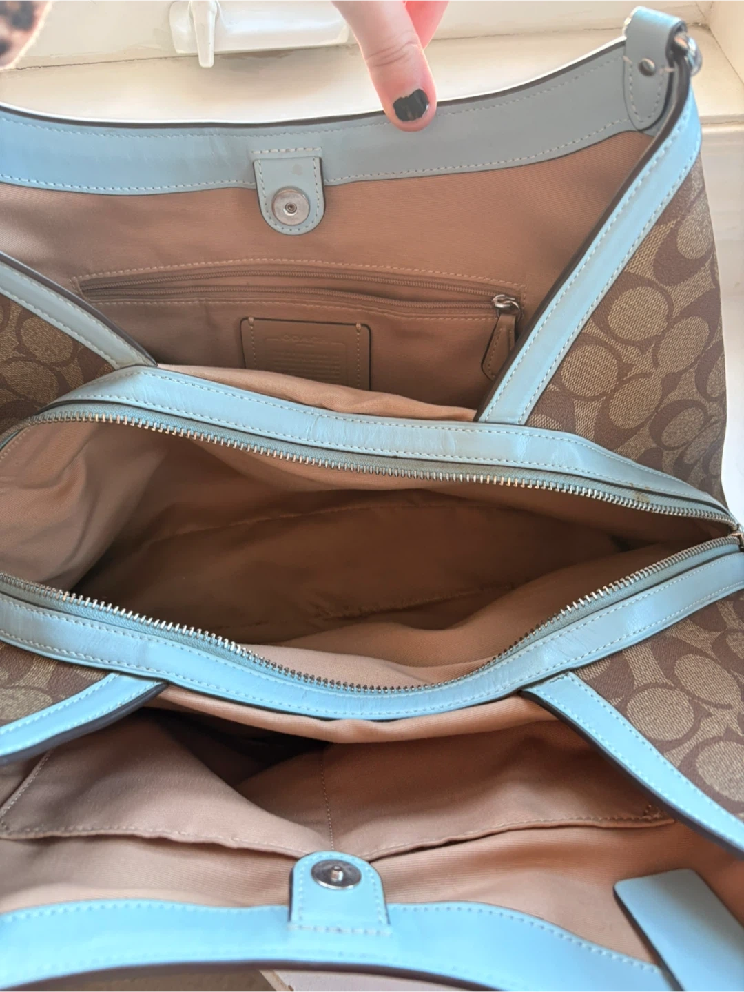Gently used Coach shoulder bag with the signature Coach pattern. It features light blue trim and a spacious interior with multiple compartments. Small rip inside, could easily be fixed.