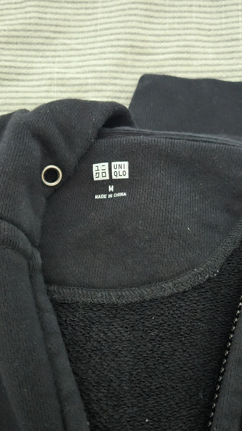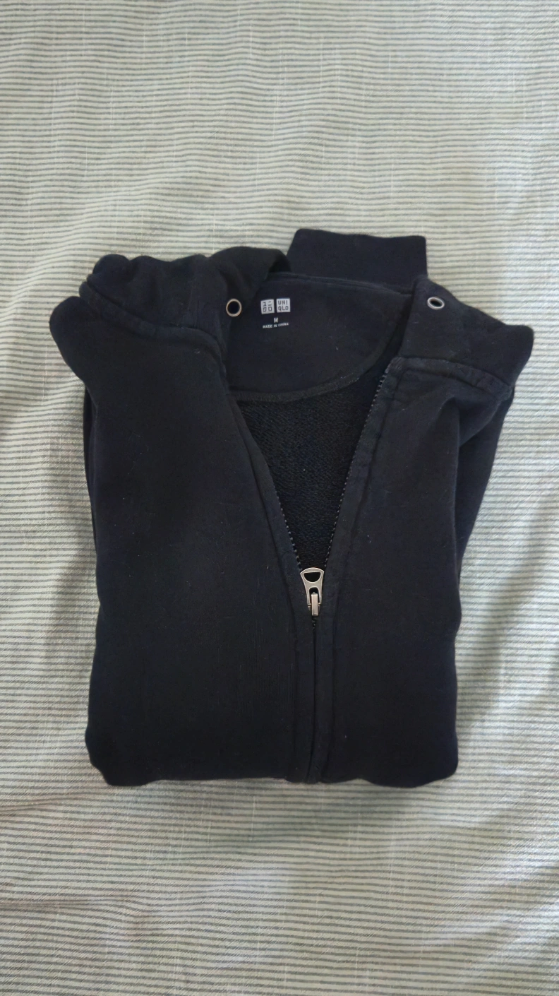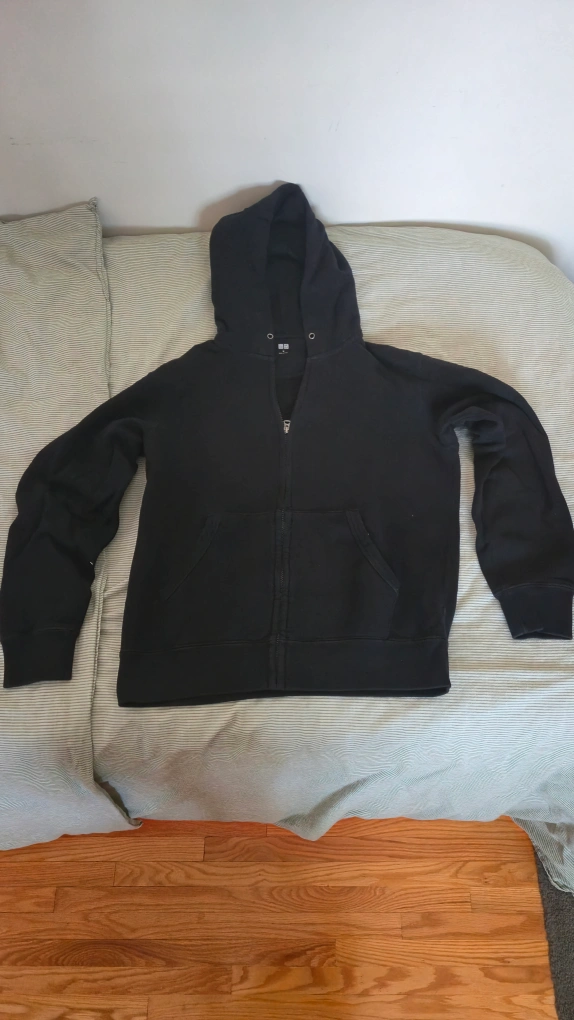 Selling a Uniqlo black full-zip hoodie in size medium. It's in great condition and a versatile piece for layering or wearing on its own. Perfect for casual outings or lounging at home! meet up dnforth or downtown