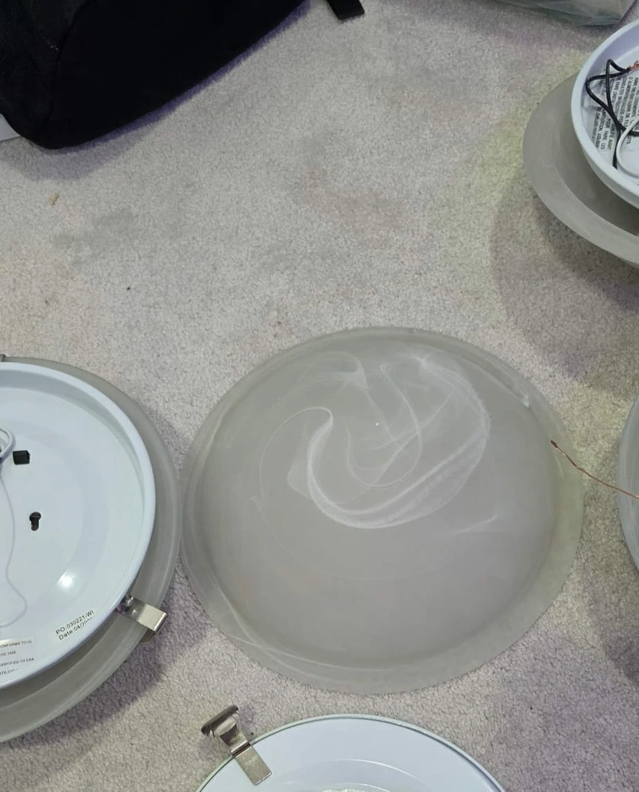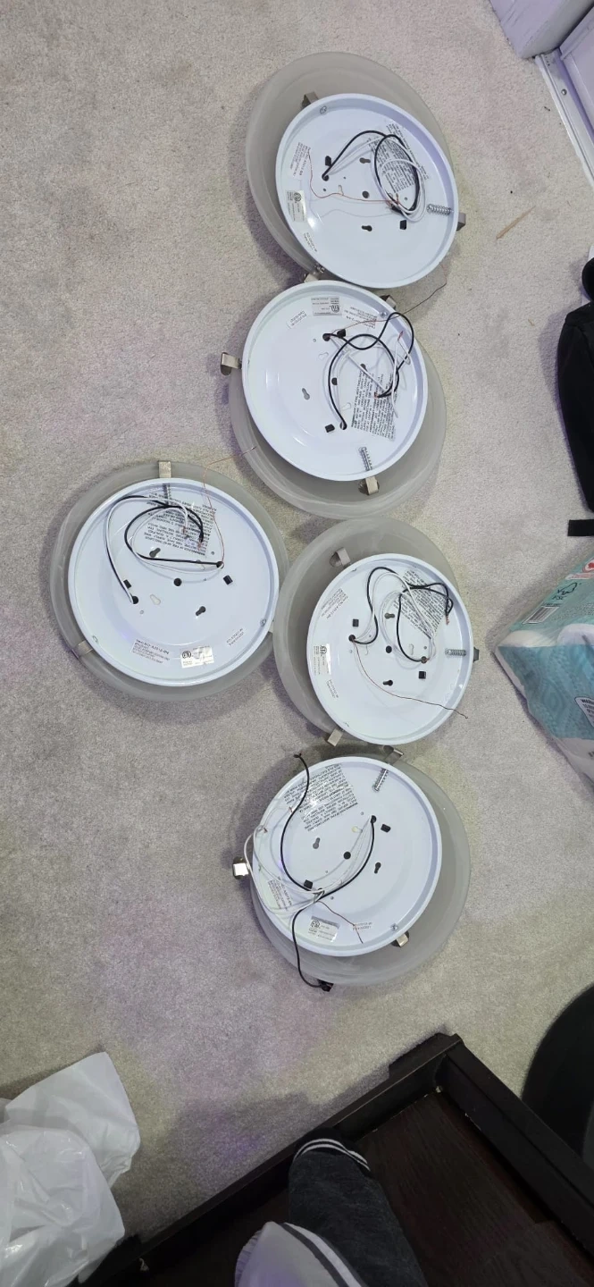 Selling a set of 5 round ceiling lights. They have a simple, clean design with a white base and a frosted glass cover. Great for hallways, bedrooms, or any room needing a bit of extra light! I'm asking 25 for each