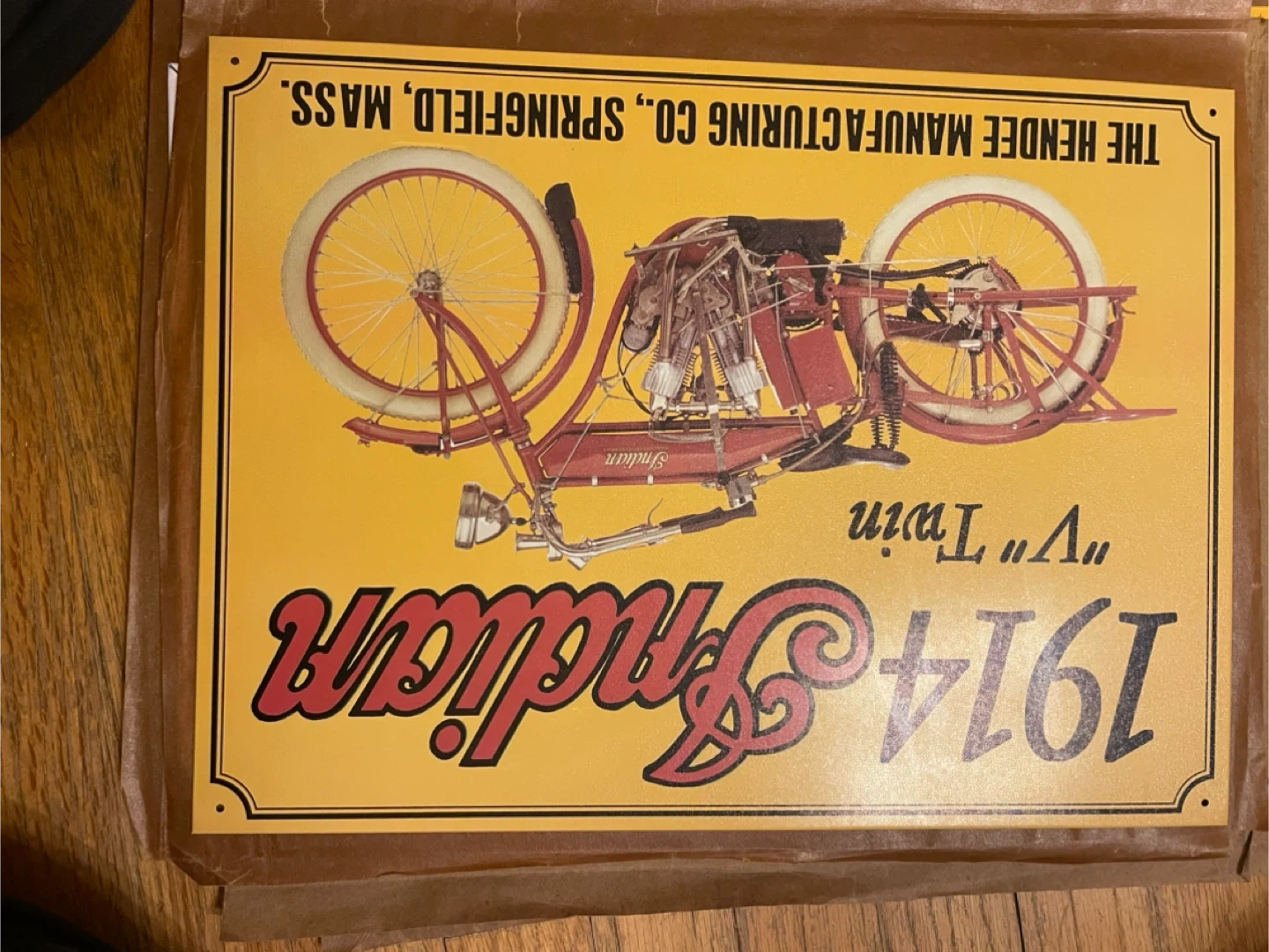 Selling a metal sign featuring a 1914 Indian "V" Twin motorcycle. The sign has a yellow background with the motorcycle image and "Indian" logo prominently displayed. It's a great piece for any motorcycle enthusiast or collector!