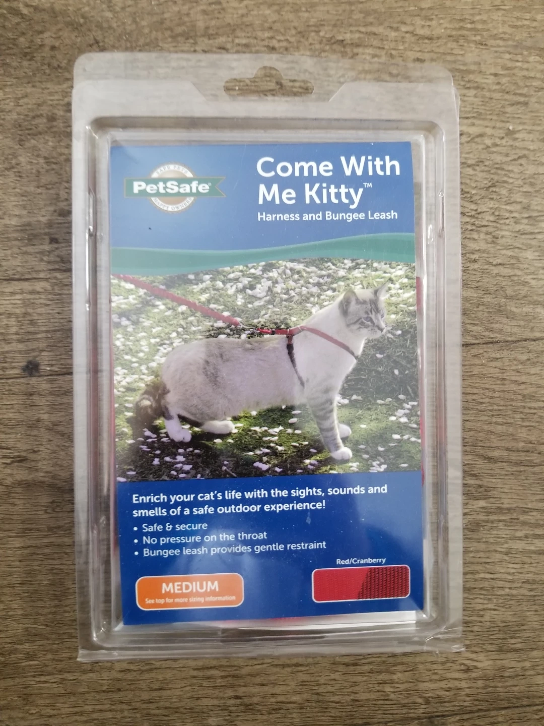 I'm selling a PetSafe Come With Me Kitty Harness and Bungee Leash in size medium! It's red/cranberry in colour and is designed to be safe and secure for your cat. The bungee leash provides gentle restraint and there is no pressure on the throat. It also features two quick-snap buckles and a 42" bungee leash . New in package