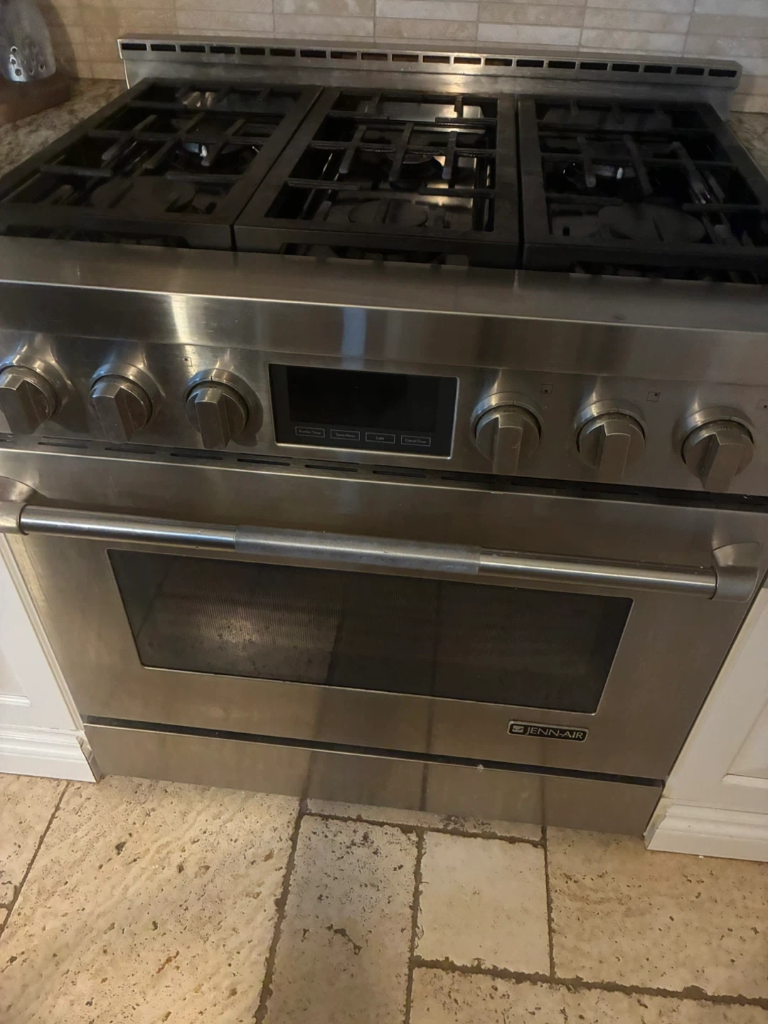 Selling a Jenn-Air stainless steel 36””gas range. It's a great appliance for any kitchen. It shows some signs of use but 6 burners is still in good working condition. Stove is not working requiring electronic repair
