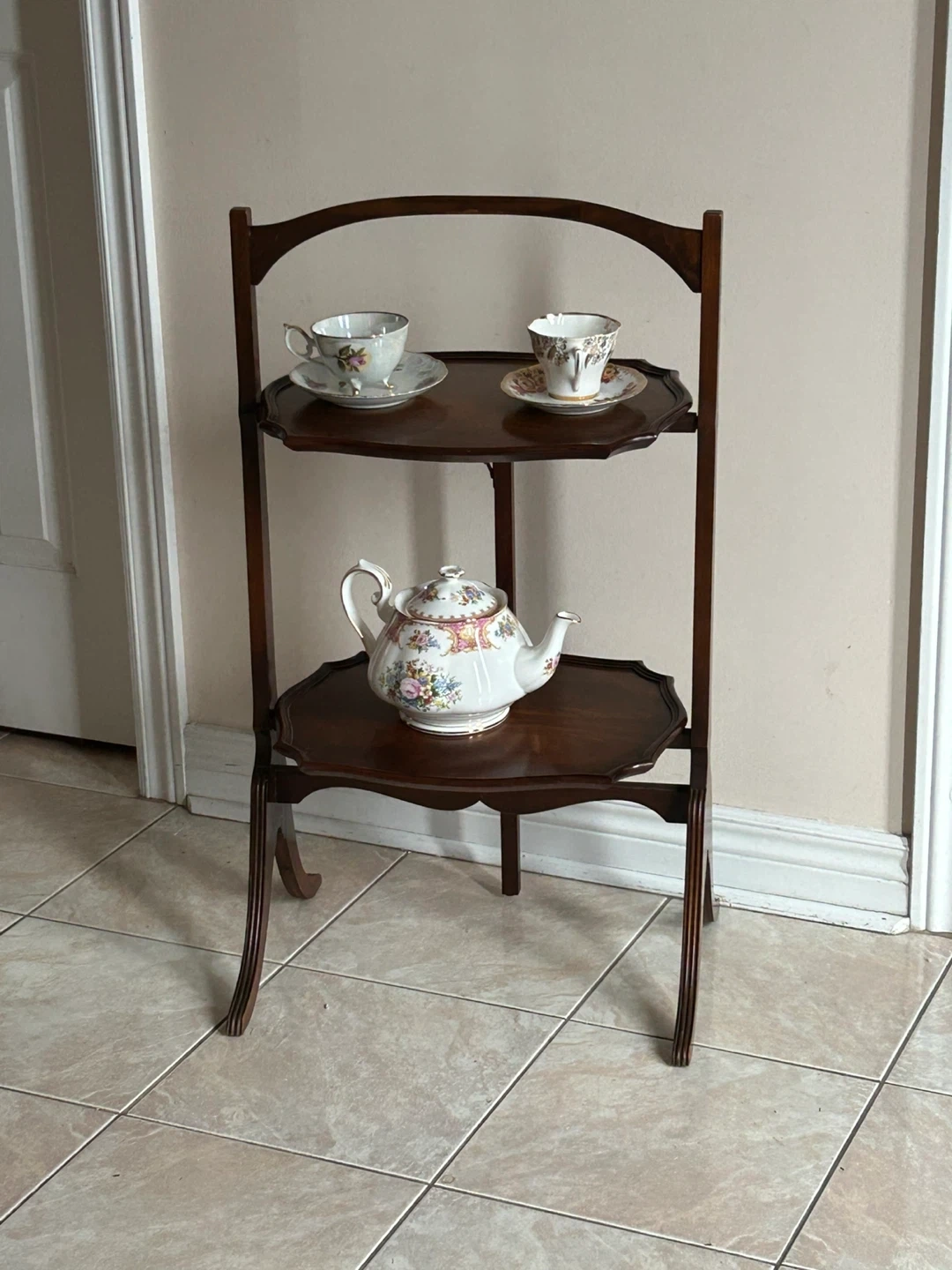 Selling a lovely vintage two-tier tea table. It's made of mahogany and has a beautiful, classic design. Perfect for displaying teacups, plants, or other decorative items!