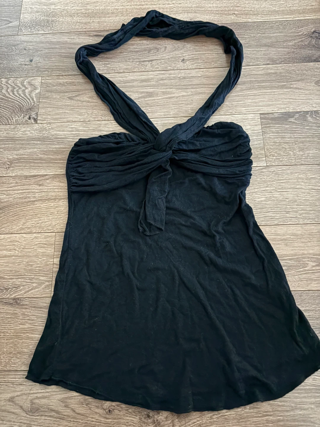 Here's a cute black halter top! It's perfect for summer days or nights out. The material is soft and comfortable, and the style is super versatile - you can actually also wear it as a tube top. Size xsmall