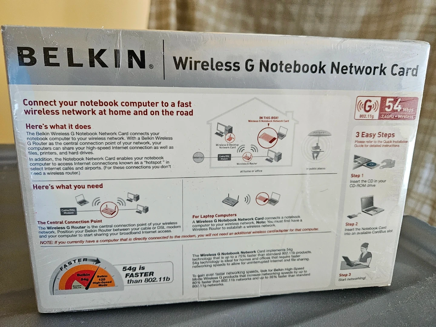 Selling a Belkin Wireless G Notebook Network Card. It connects your notebook computer to a fast wireless network at home and on the road. Compatible with 802.11g