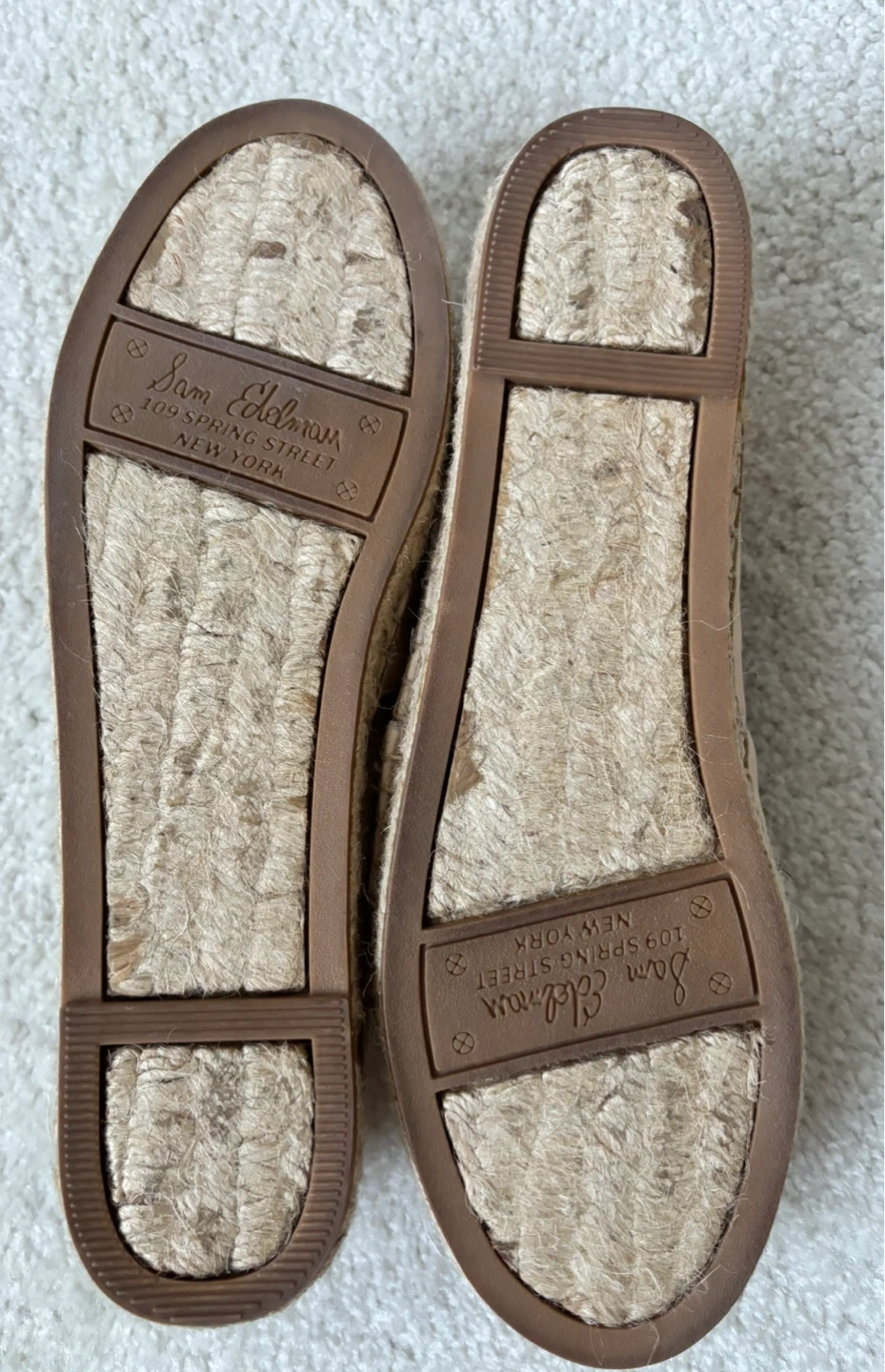 Selling a new pair of Sam Edelman Lynn espadrille flats in size 7.5M. They are a lovely light tan (slight pinkish hue) colour and made with a leather upper. Perfect for adding a touch of casual elegance to your everyday look! Sitting in my closet for a few years, name lifted on inside “pleather” piece when I tried on yesterday, these are lovely, just don’t fit. Clearing closet