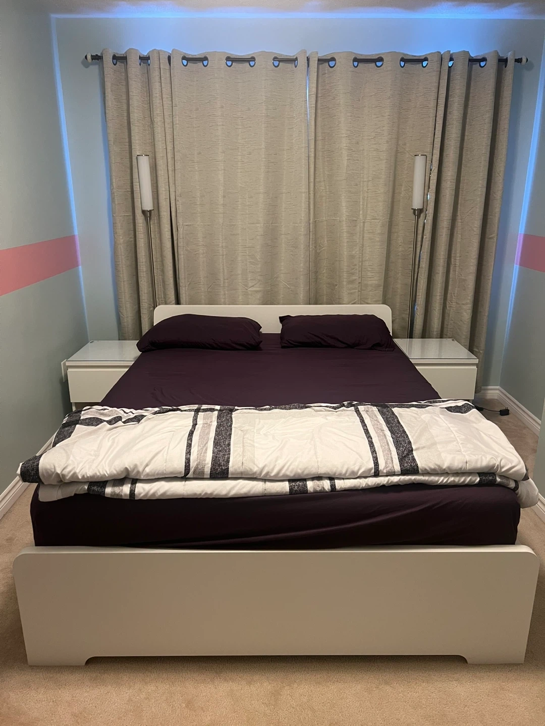 Selling a white IKEA Malm queen bed frame. It's in great shape and ready for a new home! Perfect for adding a clean and modern look to your bedroom. Easy to assemble and disassemble, making it convenient for moving