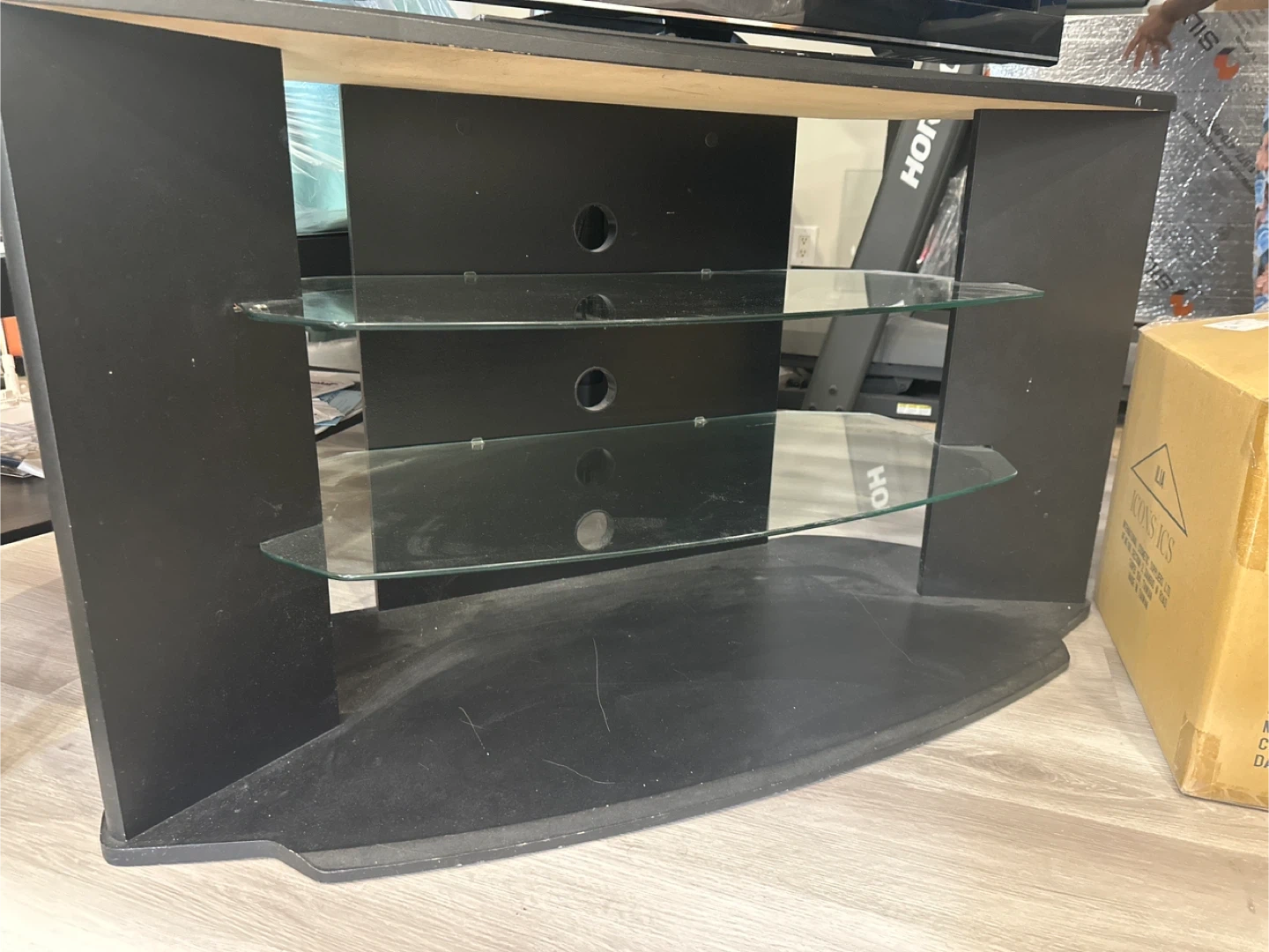 Selling a black TV stand with glass shelves. It's in used condition with some signs of wear, but still functional and sturdy. Perfect for organizing your media devices and adding a touch of style to your living room!