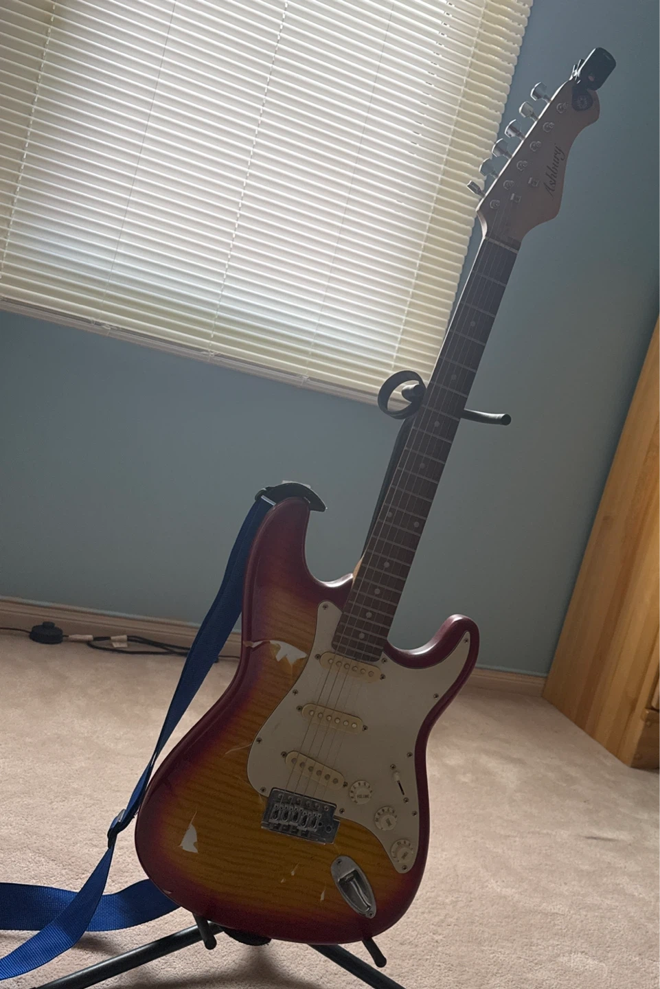 Selling an Ashbury electric guitar. It has a sunburst finish and comes with a blue strap. It shows some signs of wear, as seen in the photos, but it's still ready to play!