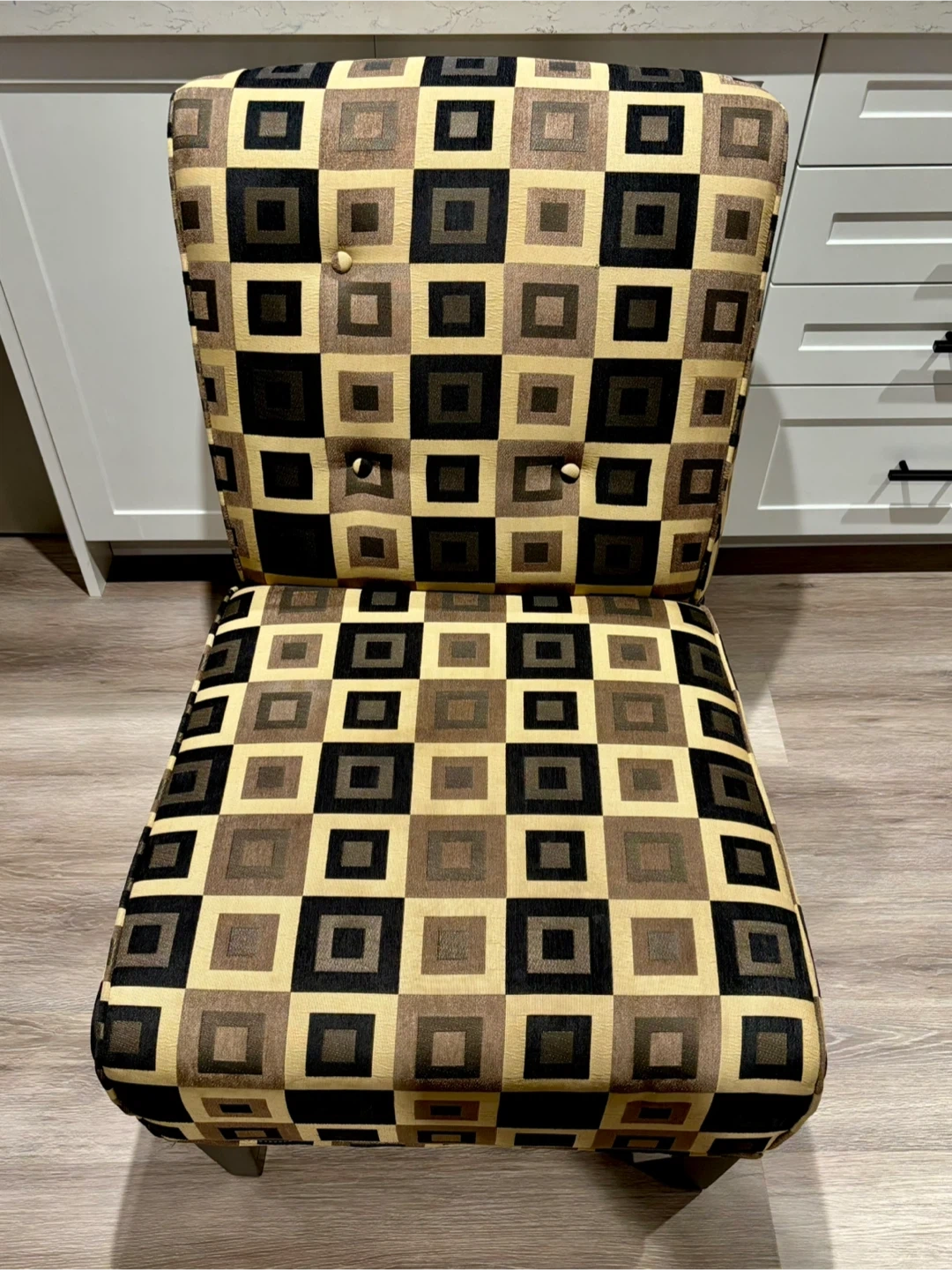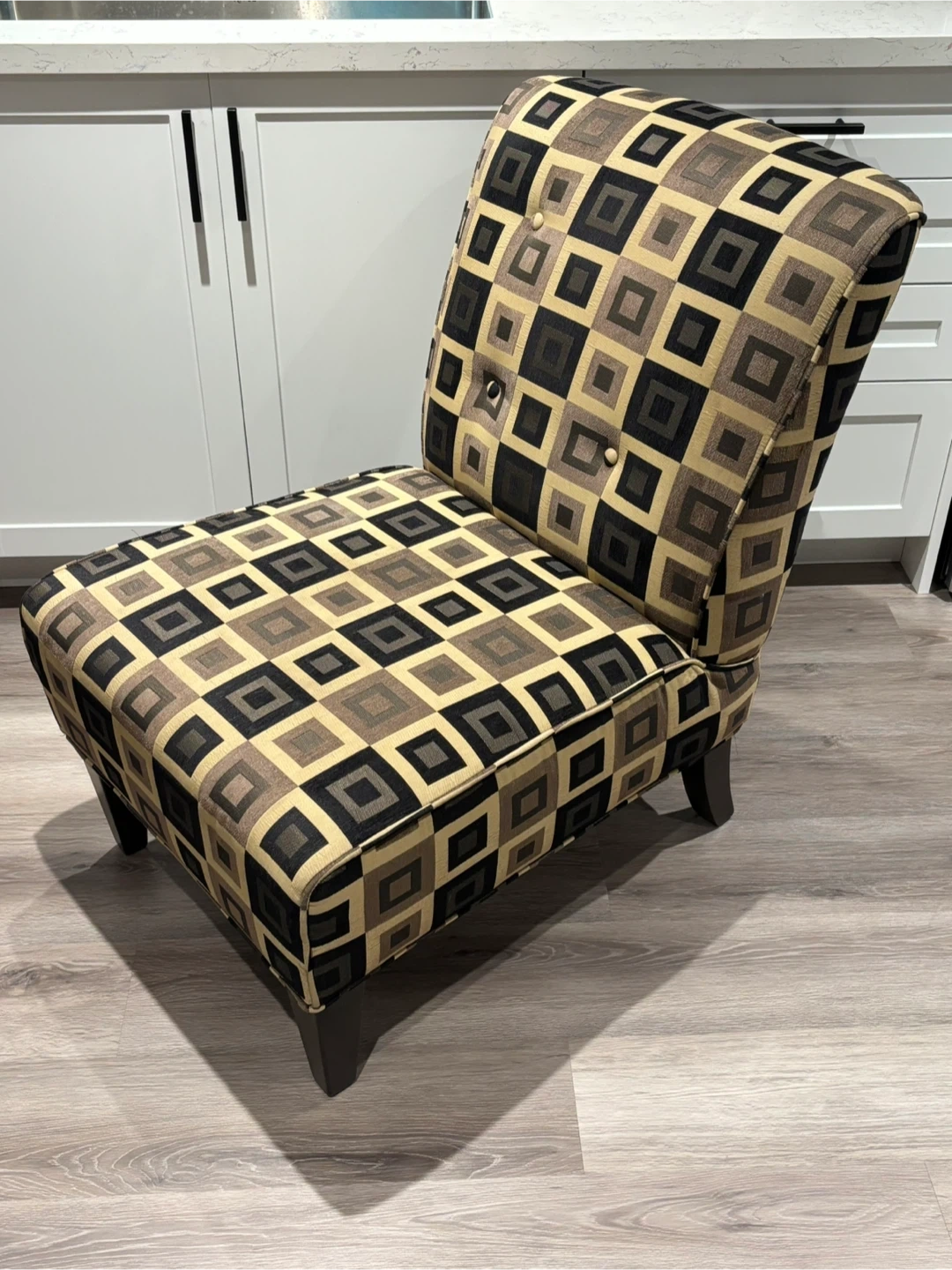 Stylish accent chair with a unique geometric pattern in shades of black, brown, and beige. Great for adding a touch of flair to any room.