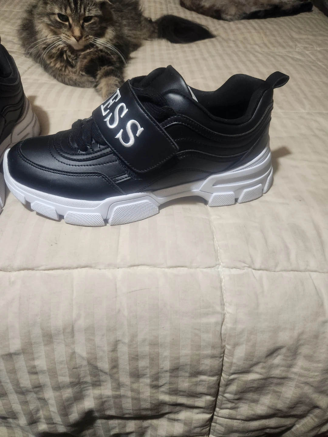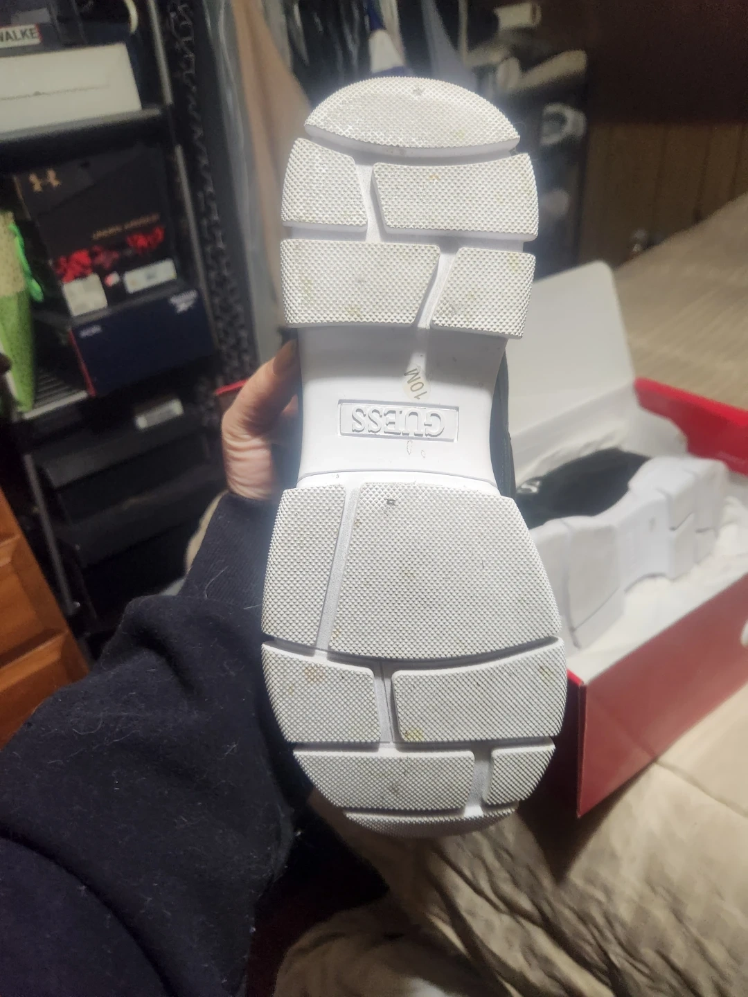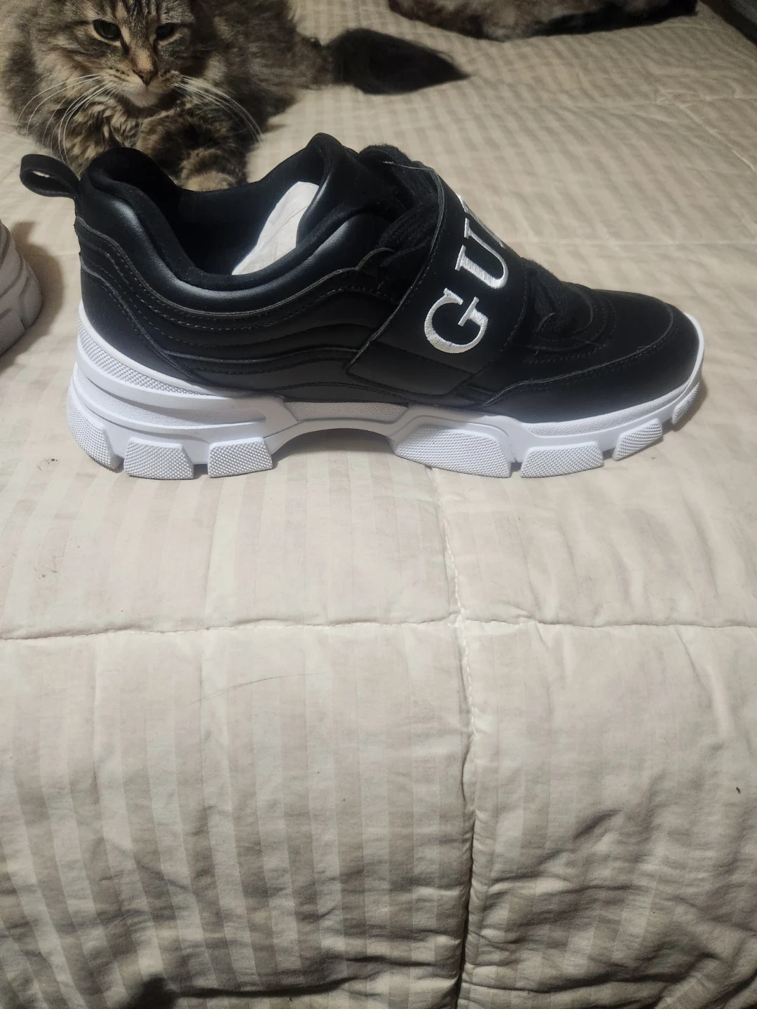 These Guess GFKathie sneakers are perfect for adding a stylish touch to your outfit! They come in women's size 10 and feature a sleek black design with a white sole. The box is included!