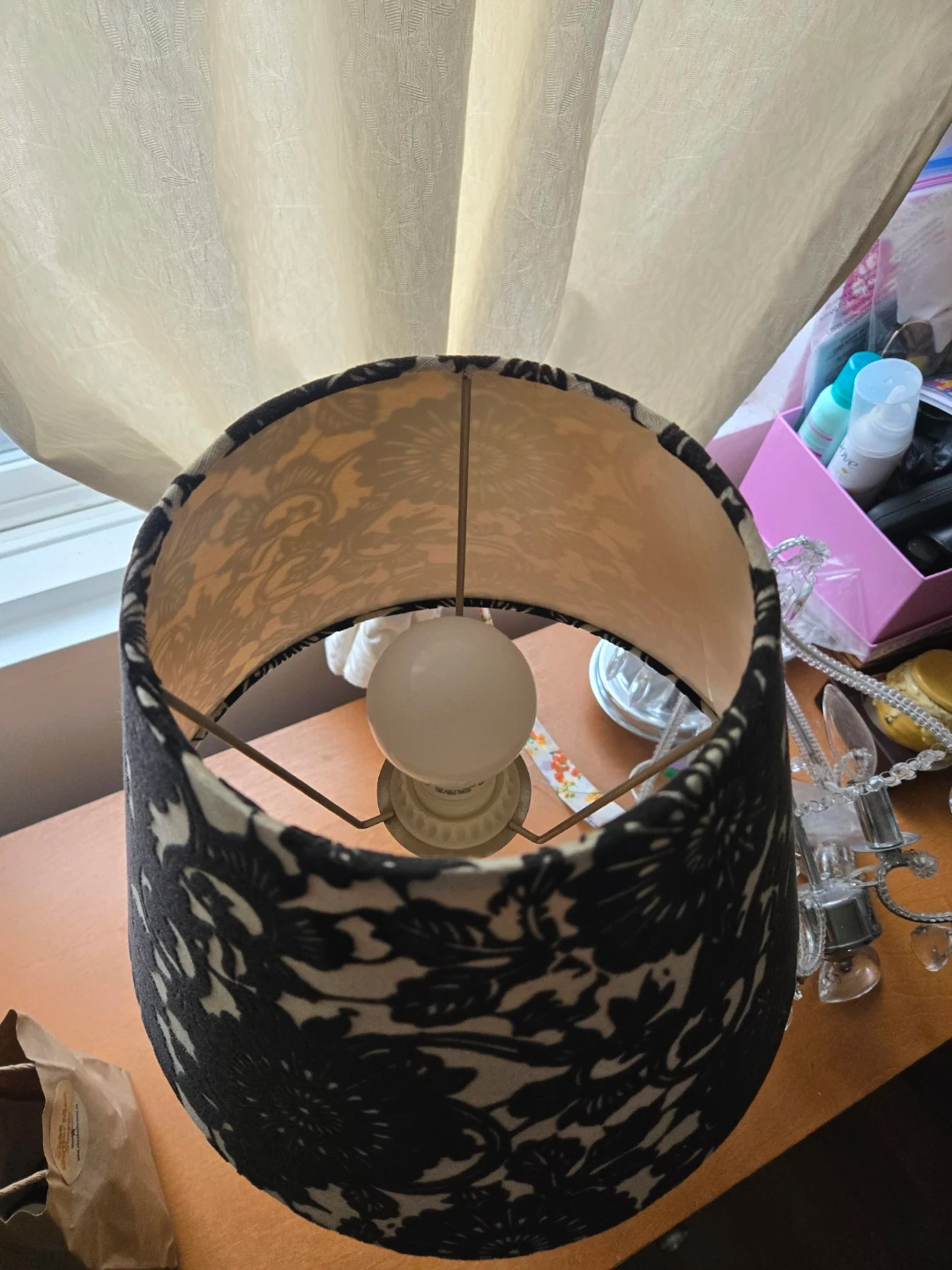 This is a cute table lamp with a floral patterned shade! It features a ceramic base with a bird figurine. It would be perfect for a bedside table or desk