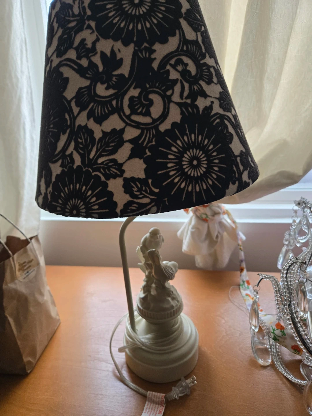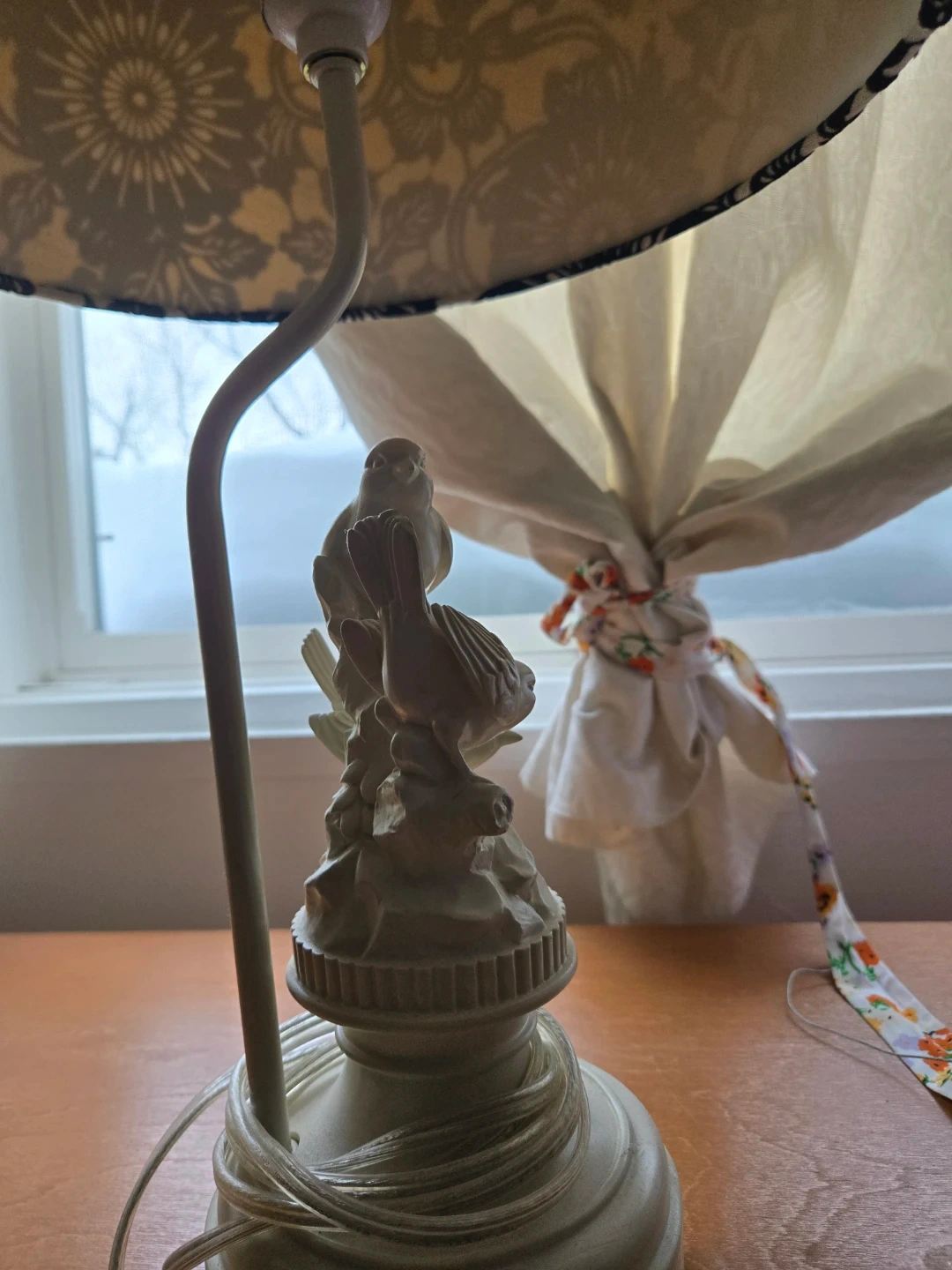 This is a cute table lamp with a floral patterned shade! It features a ceramic base with a bird figurine. It would be perfect for a bedside table or desk