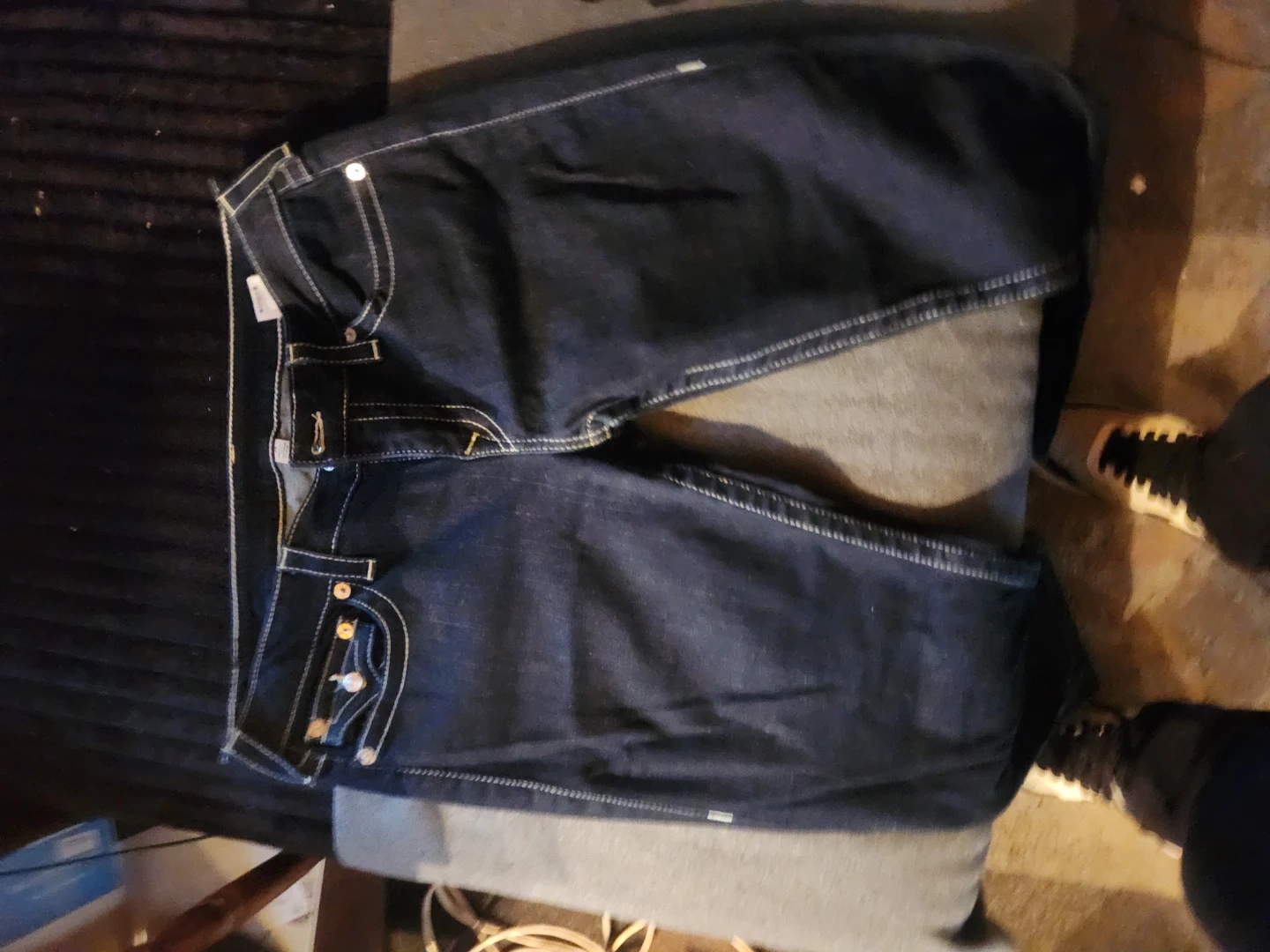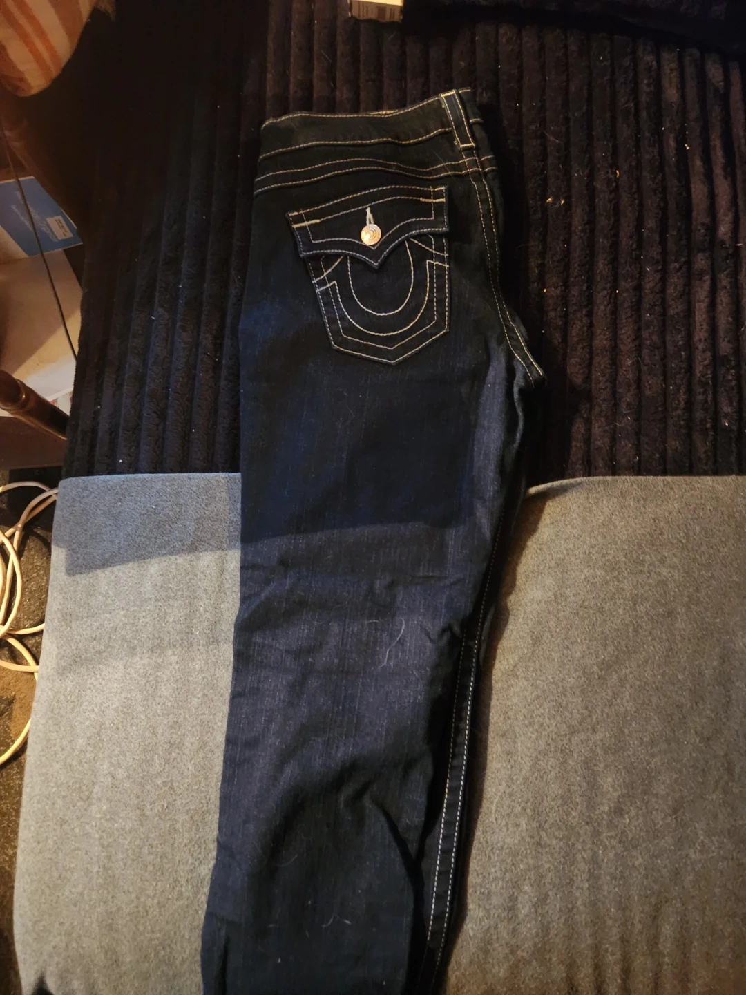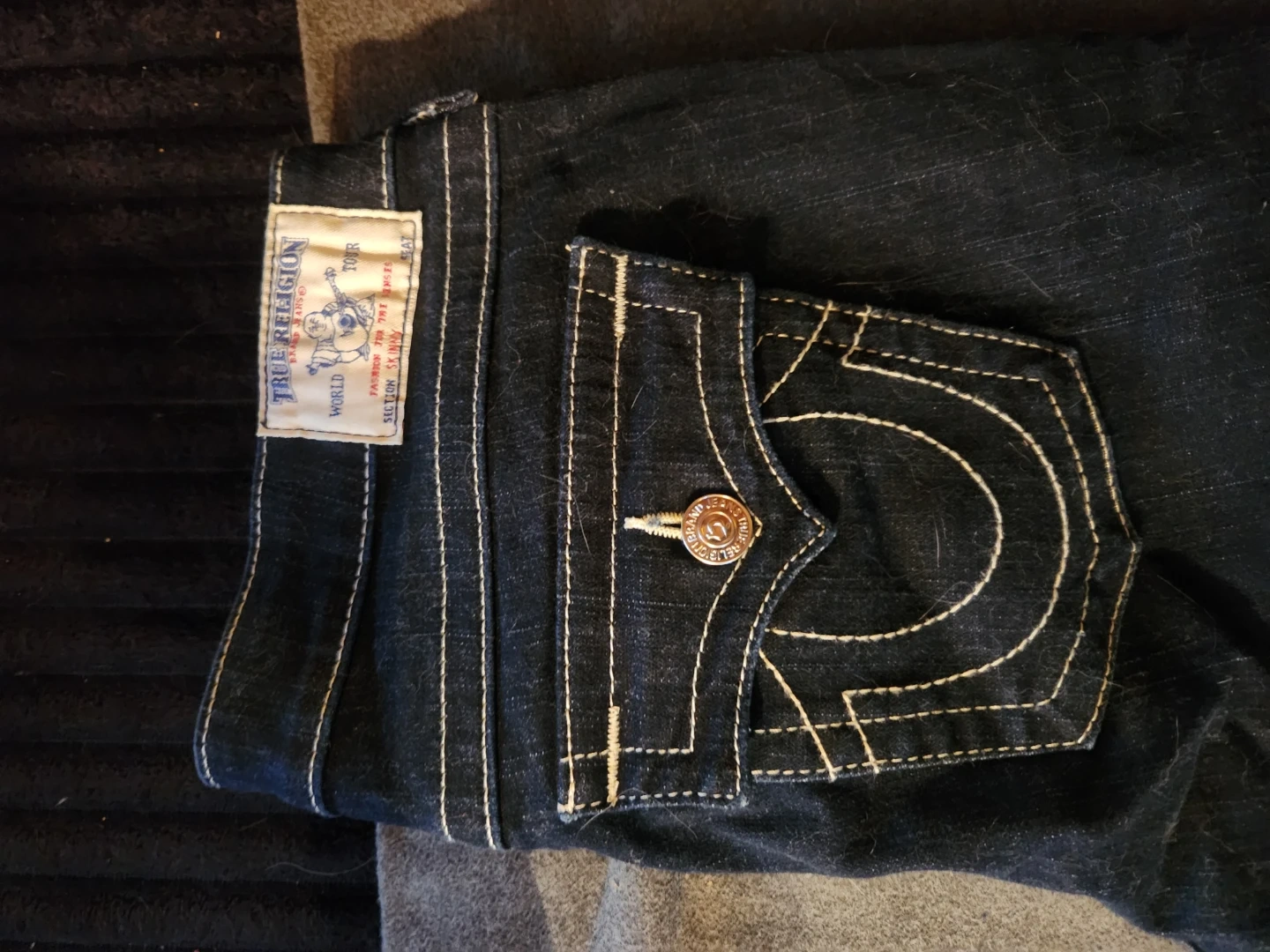 Selling a pair of True Religion jeans in size 34. They're a dark wash denim with the signature True Religion stitching on the pockets. These jeans are in great condition and ready for a new owner!
