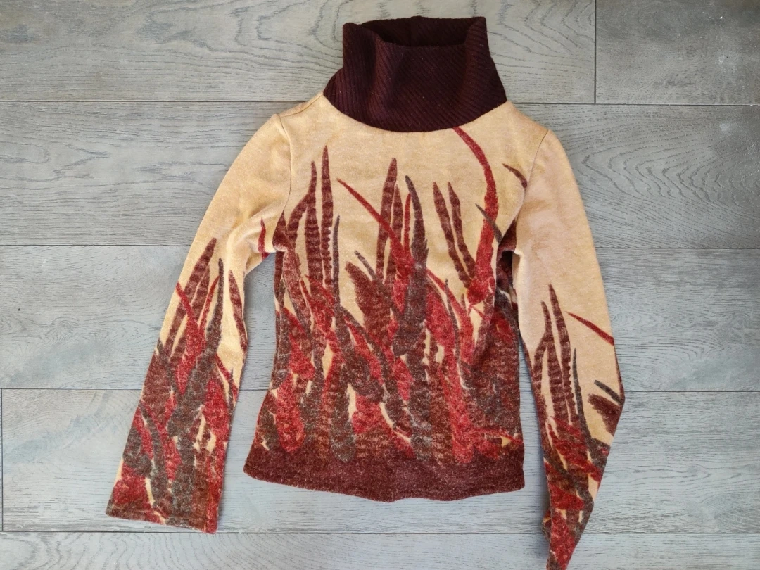 Here's a comfy long-sleeve turtleneck top! It features a unique pattern in shades of brown and red. Perfect for adding a touch of style to your wardrobe on cooler days