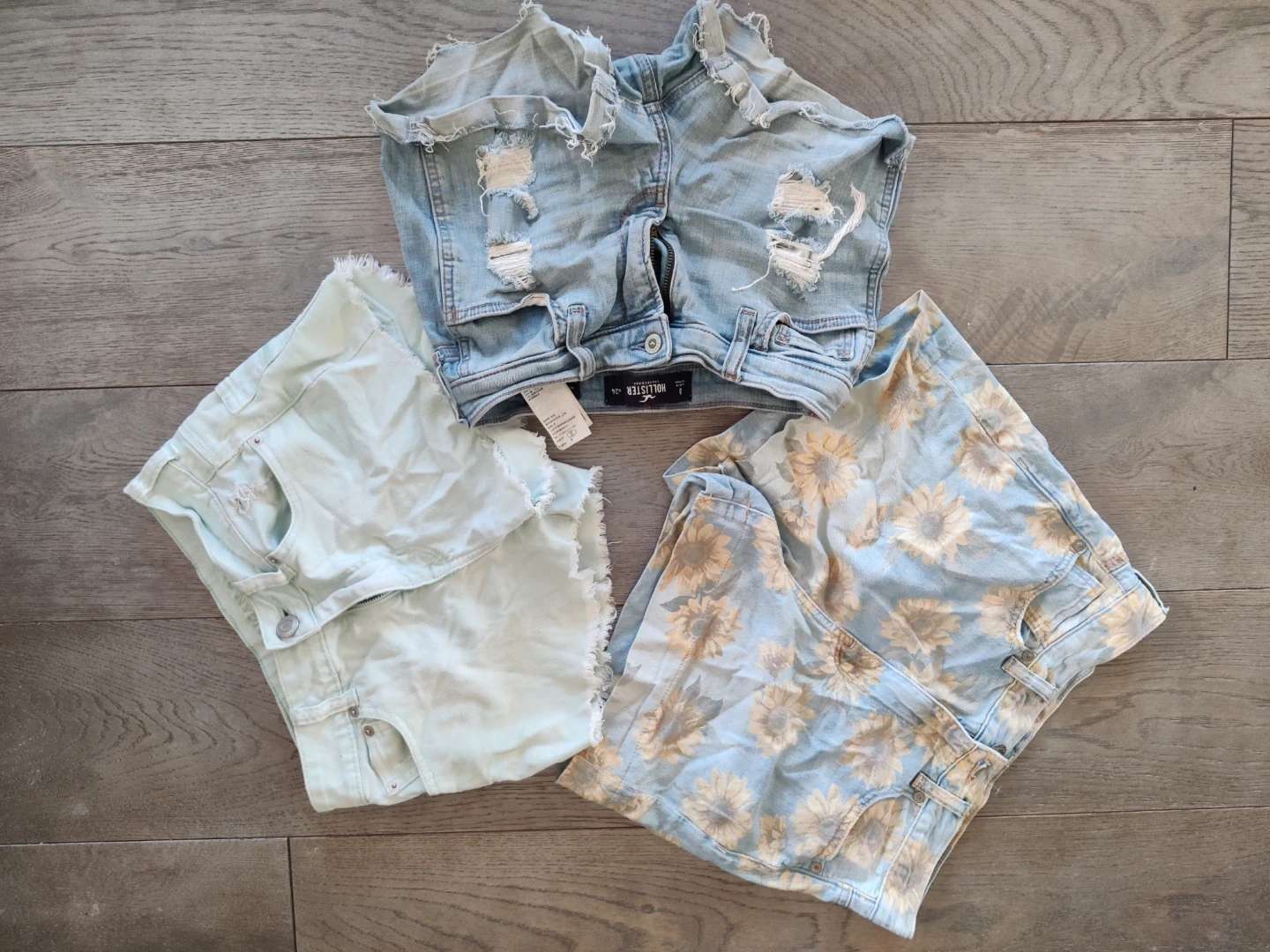 Selling a bundle of three Hollister shorts! There's a distressed denim pair, a light blue pair, and a pair with a sunflower print. All are size 1 and in good condition