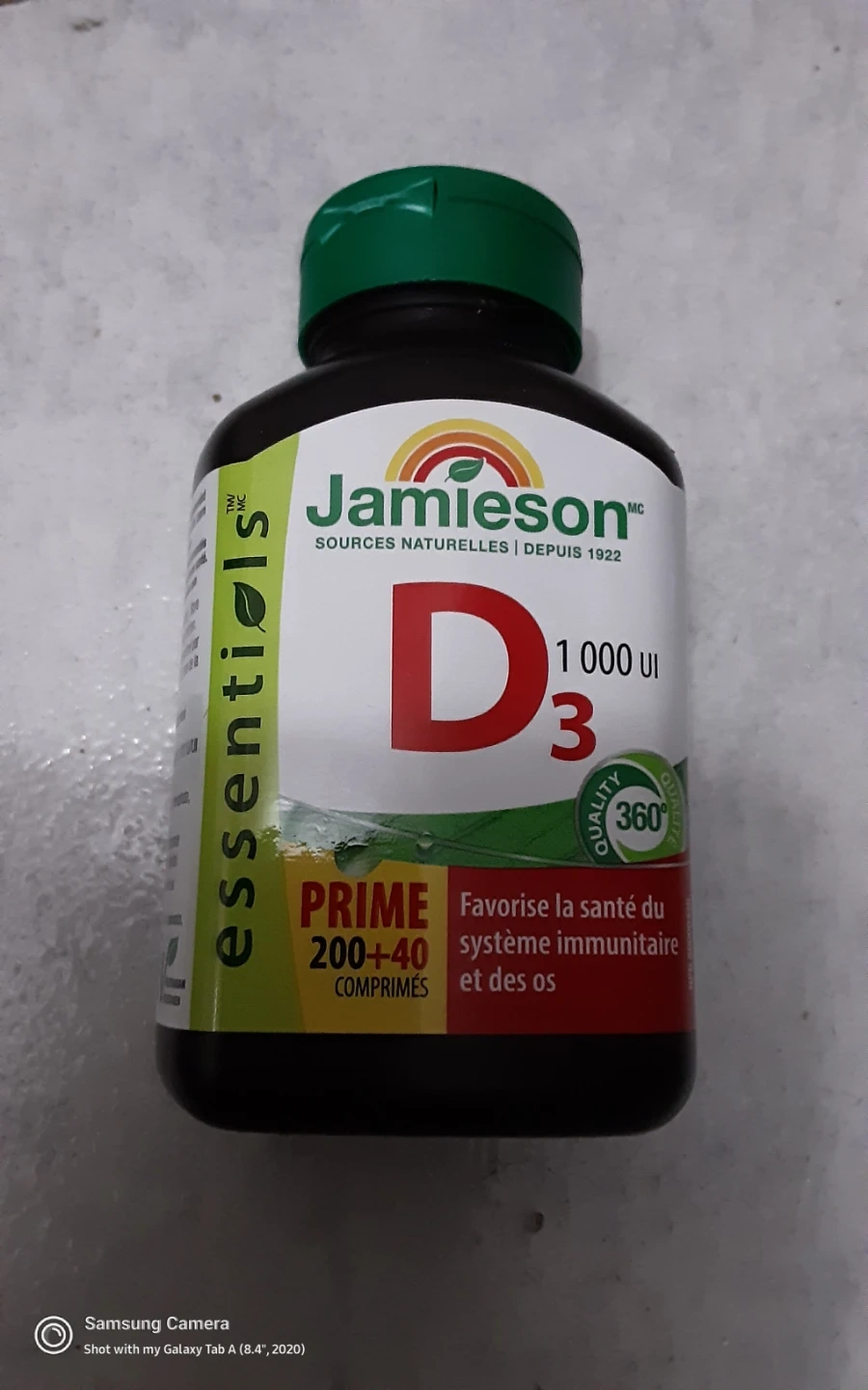 Selling a bottle of Jamieson Essentials D3 1000 UI. It's a prime bottle with 200+40 comprimés.
