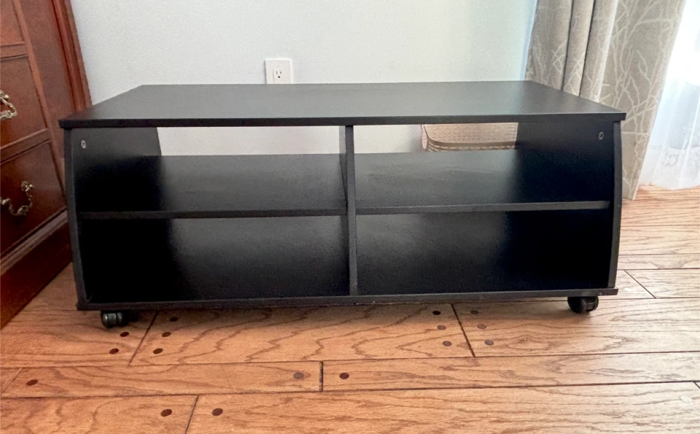 Selling a black TV stand or media console. It has a simple design with four divided shelves and sits on wheels for easy moving. It's clean and in good condition .