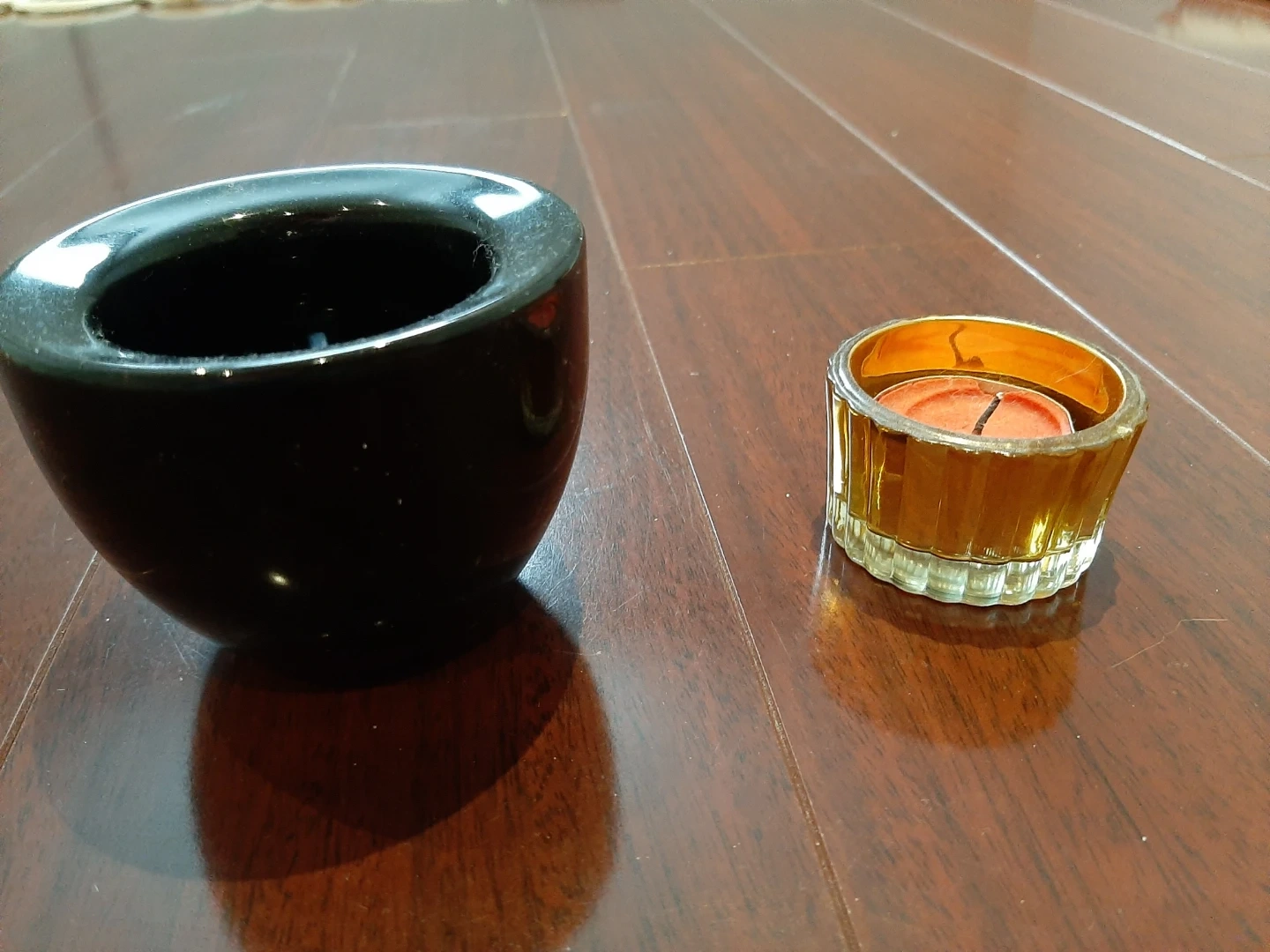 Selling a set of two candle holders. One is a sleek black bowl shape, and the other is a ribbed glass holder with a warm amber hue. Perfect for adding a cozy touch to any room!