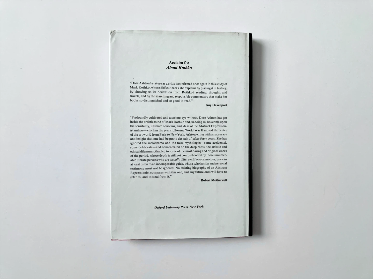Vintage and out of print first run U.S. edition hardcover copy of About Rothko by Dore Ashton, based on her 20 year long relationship with the artist and their conversations. Published by Oxford University Press in 1983. In the first full-scale study of the artist, the author chronicles Rothko's life, work, artistic formation, and philosophical preoccupations. Good vintage condition with some minor wear on the dust jacket.