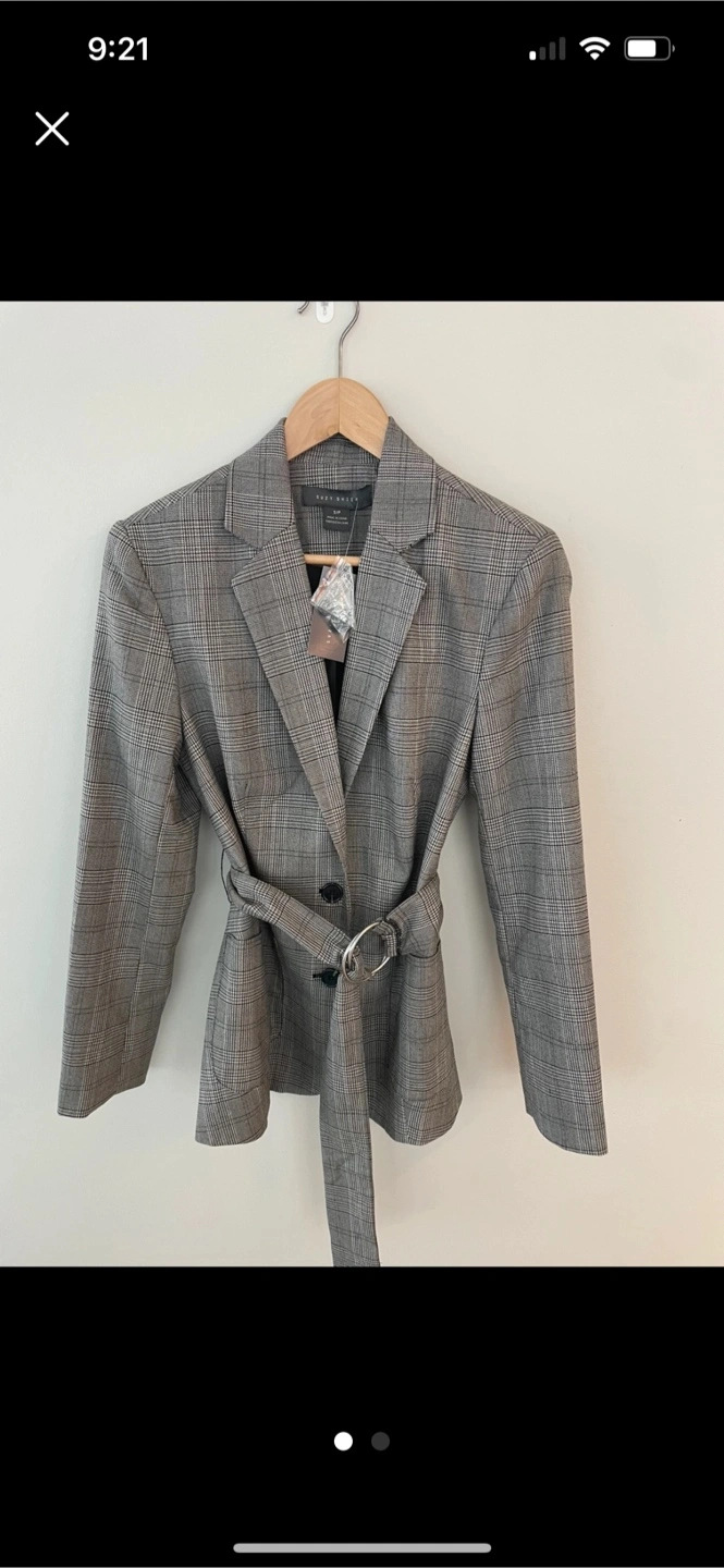 I'm selling a Petite blazer in a stylish plaid pattern. It features a flattering belted design. Perfect for adding a touch of sophistication to any outfit! Never worn.