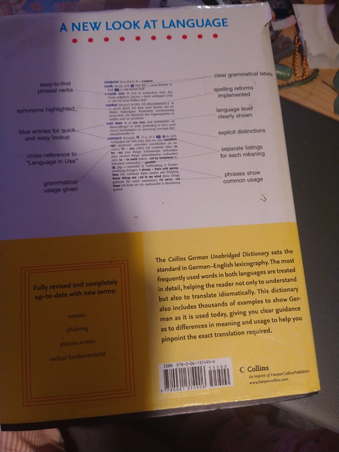 Selling a Collins German Unabridged Dictionary. This edition features complete coverage of today's German and includes thousands of contemporary technical, business, and political terms. A new look at language!